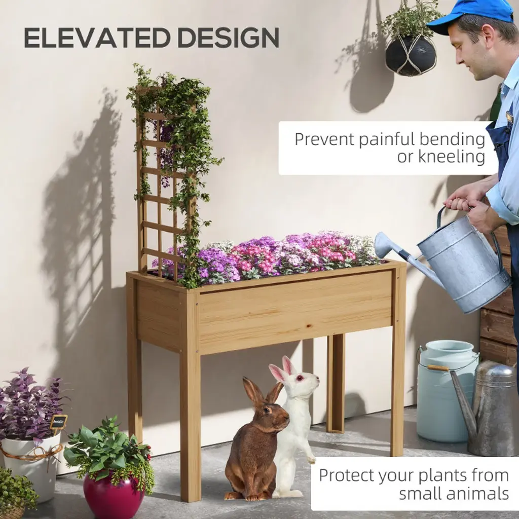 Spacious Wood Planter Box: With a 34.25" x 13.5" x 7.75" grow area that holds about 15 gallons of soil, our elevated garden bed is long and deep enough to ensure your plants can reach their potential.Grid Trellis: Bring vineyard beauty to your backyard with climbing plants. Our elevated planter box with legs has a grid trellis that allows vines to grow or gives you a place to hang flower baskets and outdoor decor.Self-Draining Outdoor Planter: Excess water can handle itself. Our raised trellis planter features a self-draining design and a non-woven fabric filter. Plants kept in the box will stay fresh, and soil won't fall away after watering.Outdoor Ready Wood: Our raised garden bed with trellis is formed out of strong solid fir wood and protected with a waterproofing paint that lets the beauty of its wood grain pattern shine through.Raised Flower Bed with Trellis Info: Overall Dimensions: 36.5" L x 15.75" W x 55.5" H. Grid Trellis Size: 13.5" W x 28" H. Weight Capacity: 154 lbs. Assembly required.