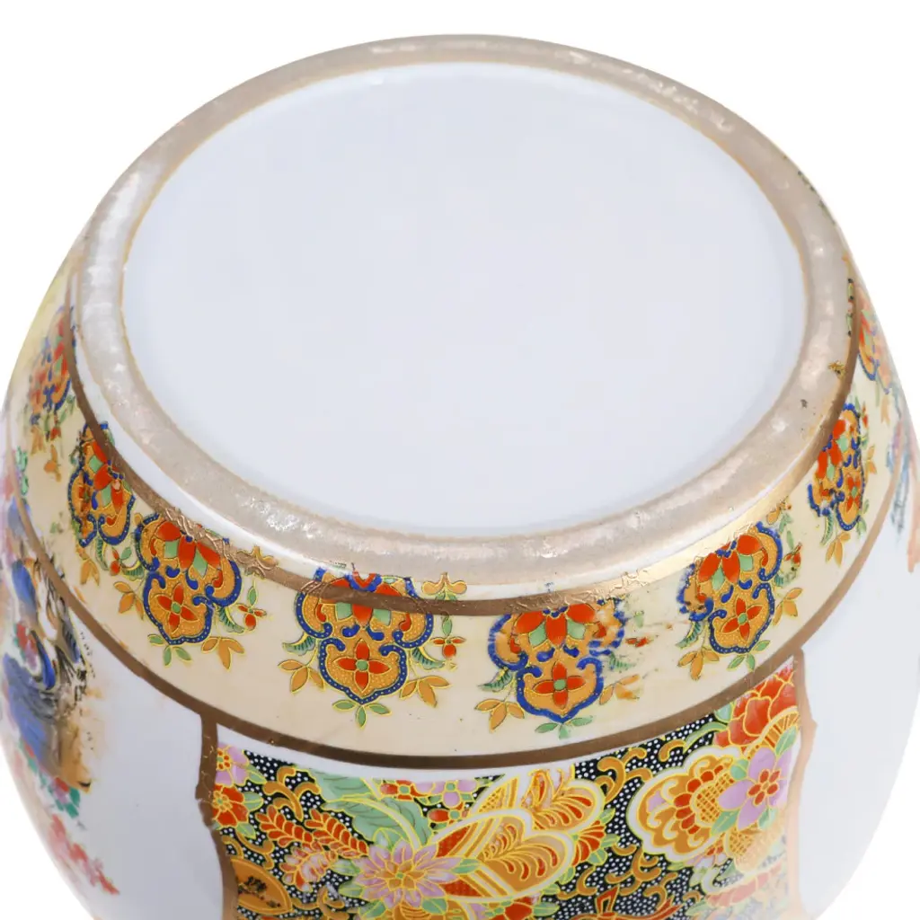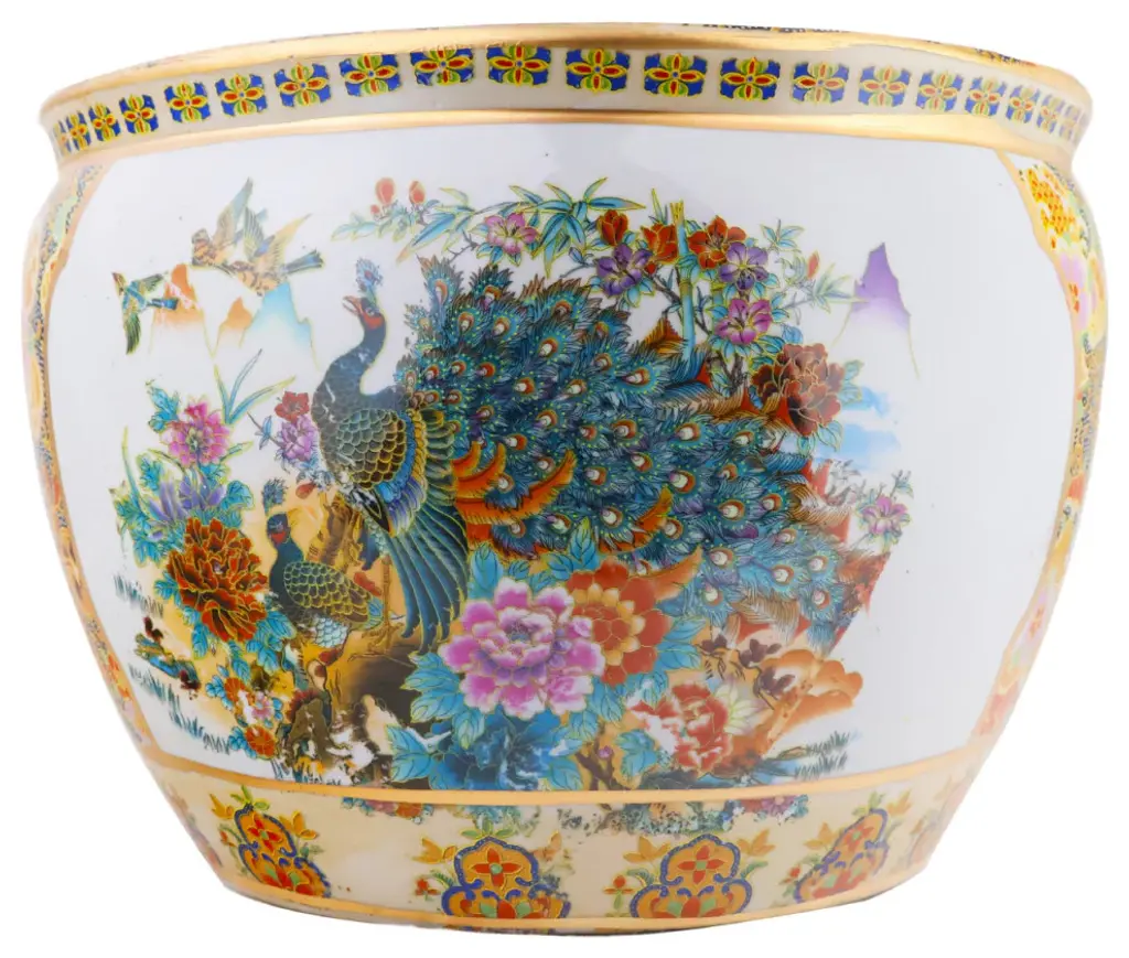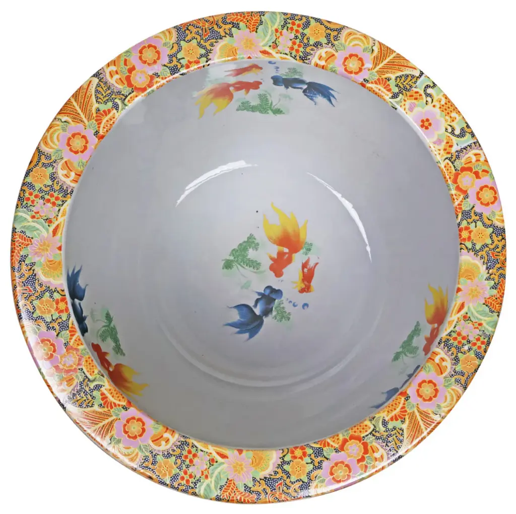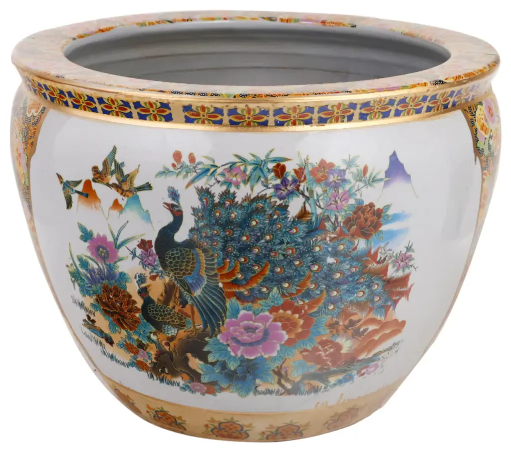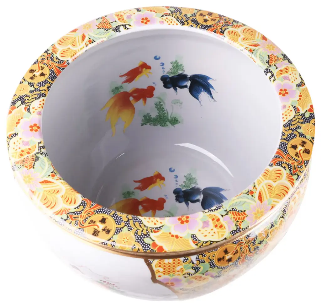 Available in six sizes, this 14" porcelain fish bowl planter from China has a traditional Japanese Satsuma style pattern. Two panels are painted with geisha''s in kimonos while butterflies and flowers are on the other two panels. Inside the fishbowl are decorative swimming Koi fish. Rich metallic gold is glazed in floral accents so thick that it''s textured. The color pallet is wide and the contrasting tones make a great visual. We provide hard to find large floor sizes or use smaller sizes for table top decor. Add an elegant design statement to your planter with one of our vase stands available in a wide assortment of styles and wood types. Remember to use the bottom diameter size when selecting your stand.• Perfect for indoor or outdoor use • Made from fine Chinese porcelain, fire glazed inside and outside for added strength• Impervious and water tight; will not leave water marks • 14 inches diameter by 11 inches high. Inside is 11 1/2 inches. Base is 9 1/4 inches.