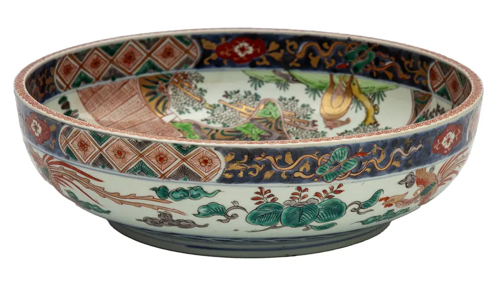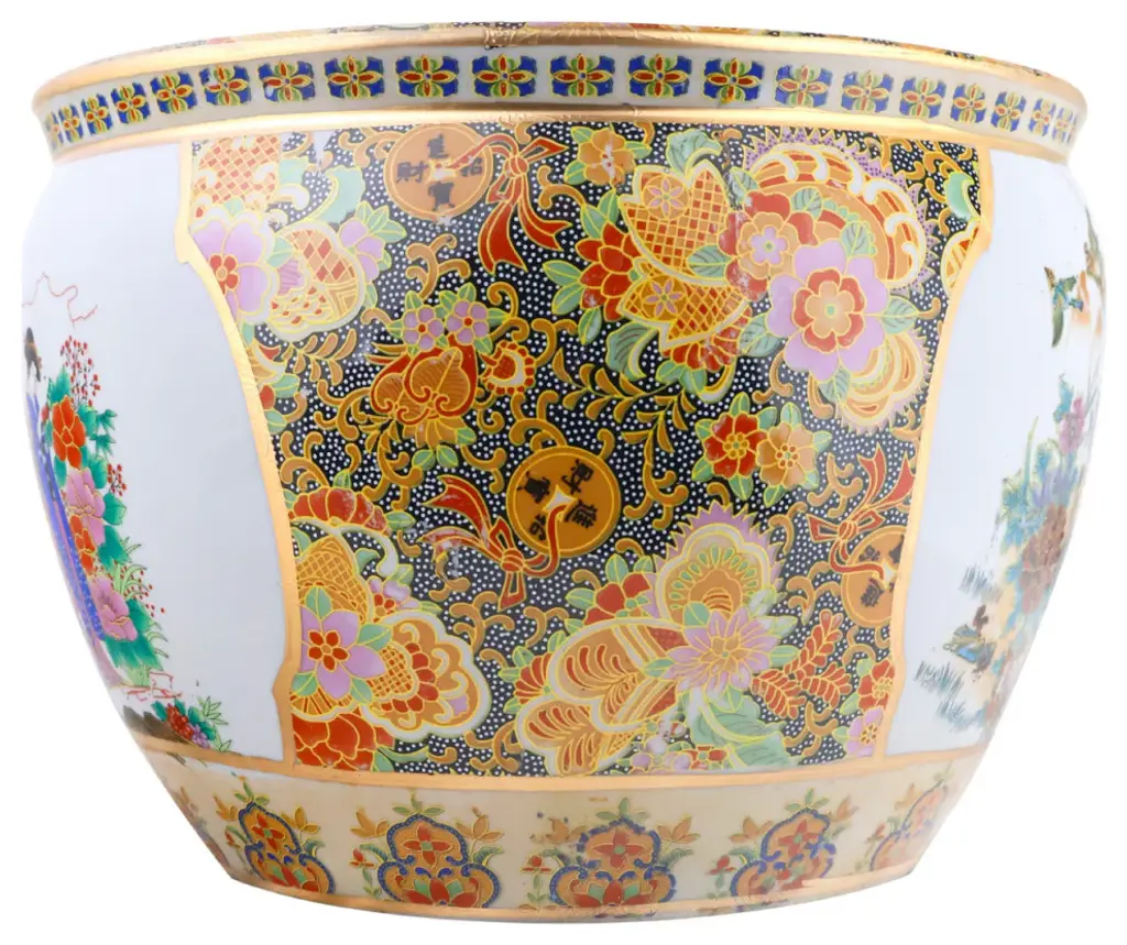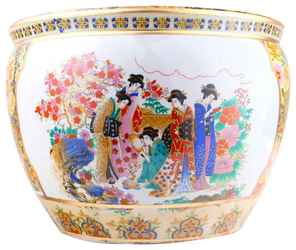 Chinese Porcelain Fish Bowl Planter, Satsuma Geishas, 14"