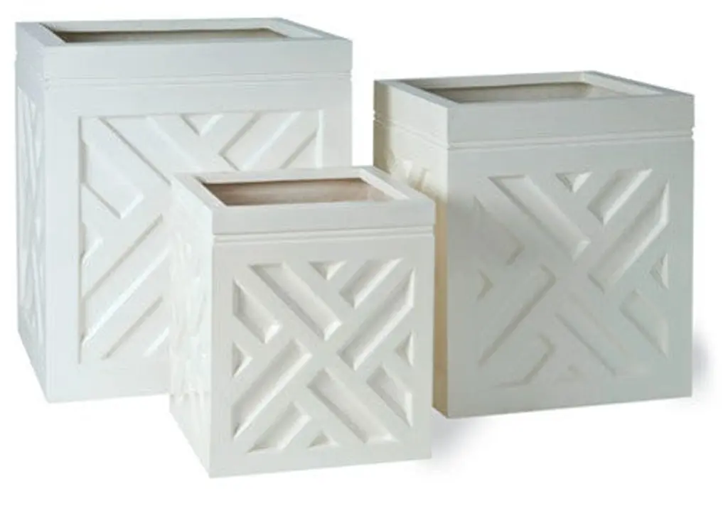 A chic, modern classic. The Chippendale planter is perfect for every garden, from Martha's Vineyard, to Del Mar. Madefrom tough, versatile fiberglass - lightweight, maintenance free and completely frost proof and non-corrosive. Small: 12"L x 12"W x 14"H Code: CH12 Medium: 15"L x 15"W x 18"H Code: CH15Large: 18"L x 18"W x 20"H Code: CH18This planter comes without drainage holes as standard, but we are happy to pre-drill them upon request.Long-lasting (up to 30 years) fibreglass reproduction piece. Production time up to 12 weeks, contact us for expedited availability.