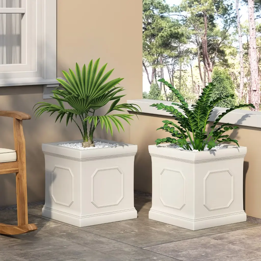 Create a refined statement for your home, starting from your outdoor space. From its beautifully embossed accents to its lightweight concrete structure, our planter set will instantly enhance your patio or backyard space with style. These accessories offer a durable construction to ensure that your plants have a stable home to grow. Complemented with a natural stone finish, this planter set offers a classic look to your garden or porch. Perfectly crafted to hold your plants, these pieces are the perfect accessory for your green thumb. Material: Lightweight Concrete Color: Antique White No Assembly Required Large Dimensions: 17.75 inches deep x 17.75 inches wide x 18.50 inches high