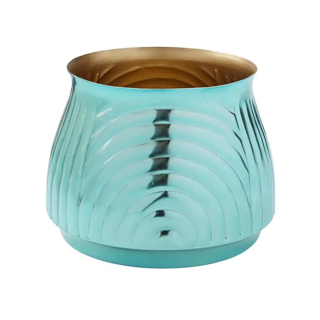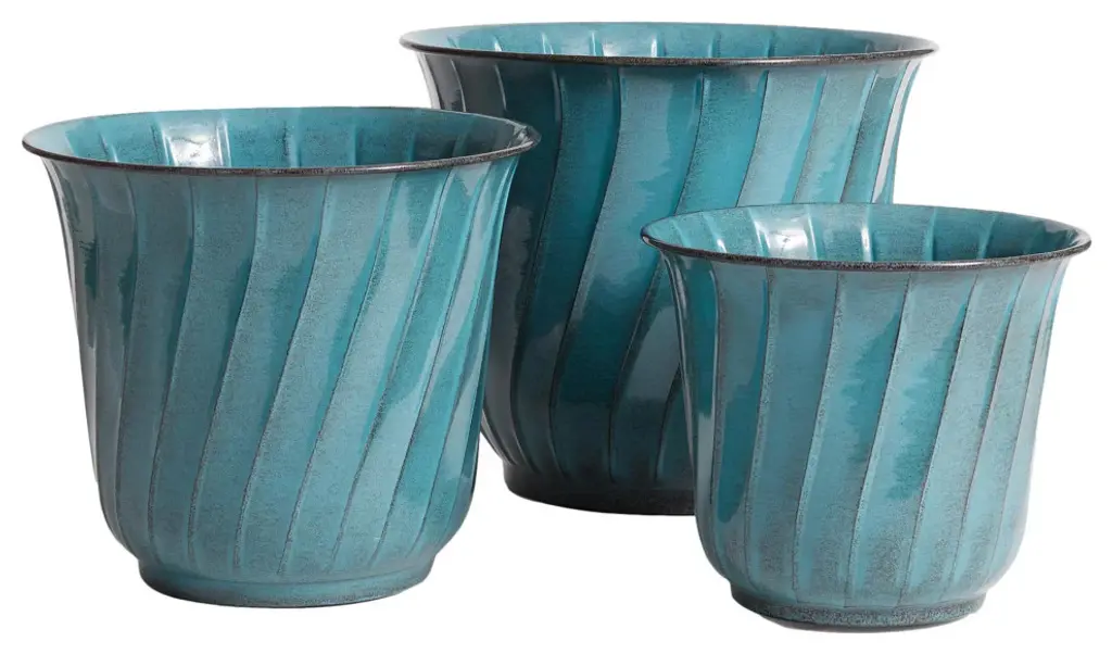 Classic Set Of 3 Ribbed Twist Metal Planters Teal Blue Elegant Outdoor Safe
