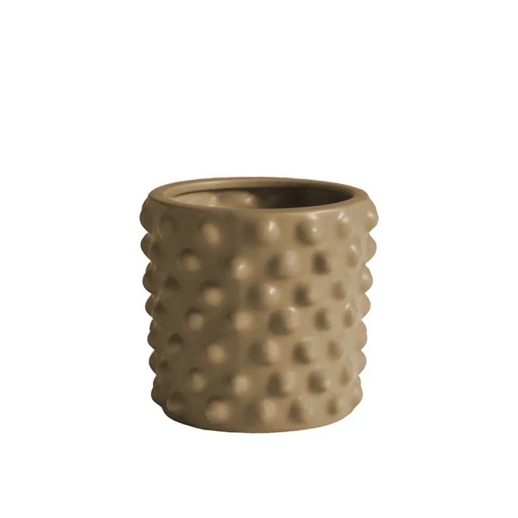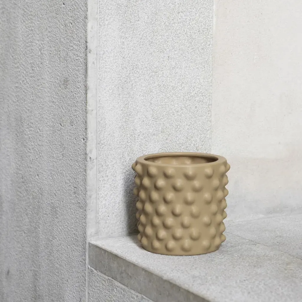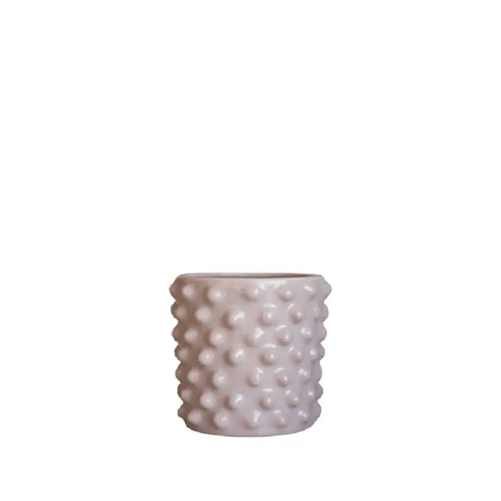 Ceramic pot of Scandinavian design with a knobby, matte surface, except for dusty pink which is glossy.