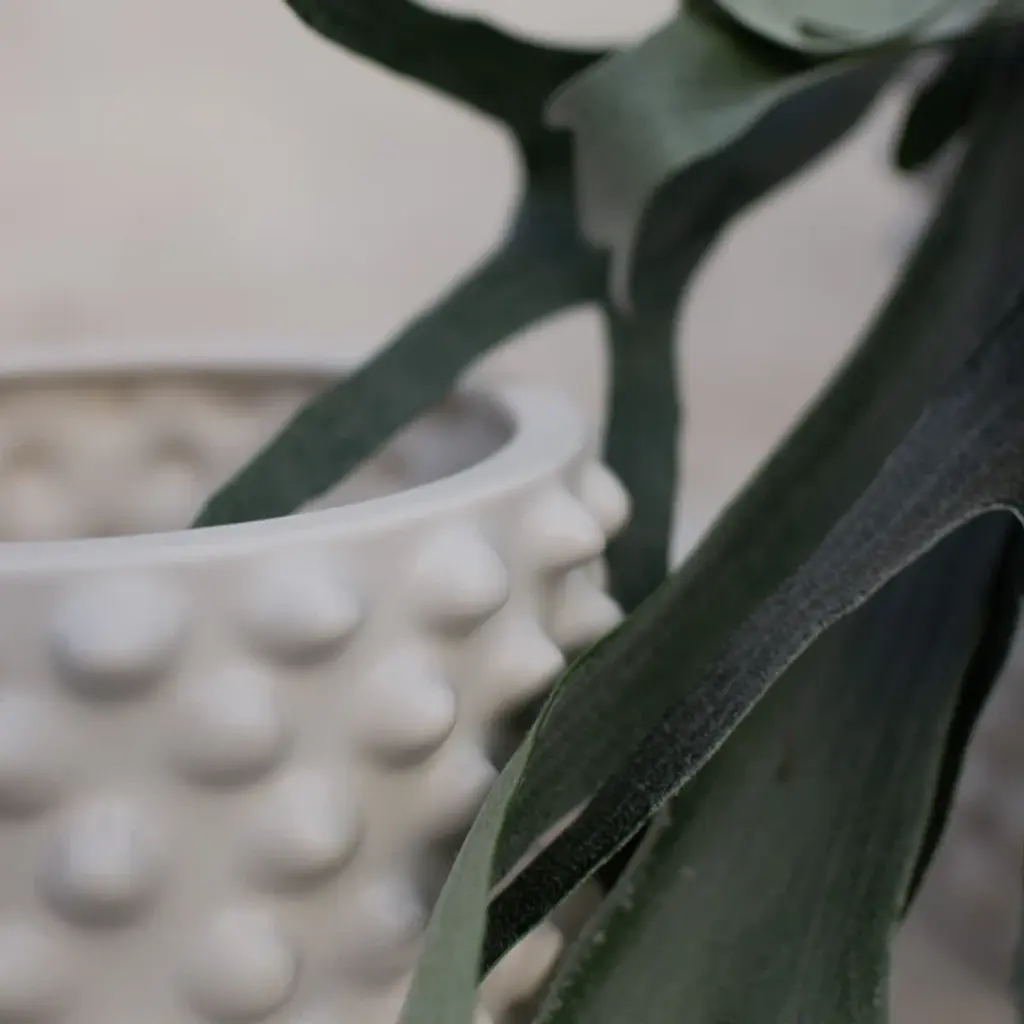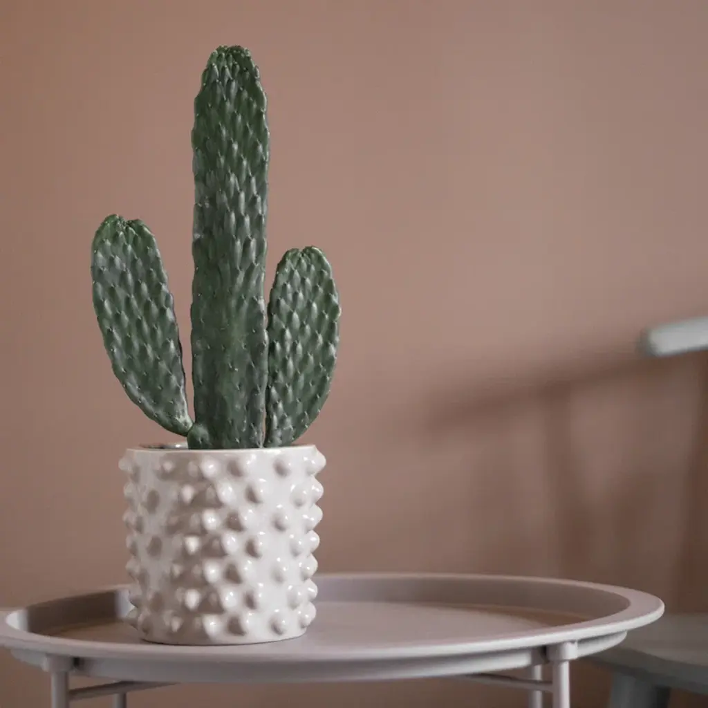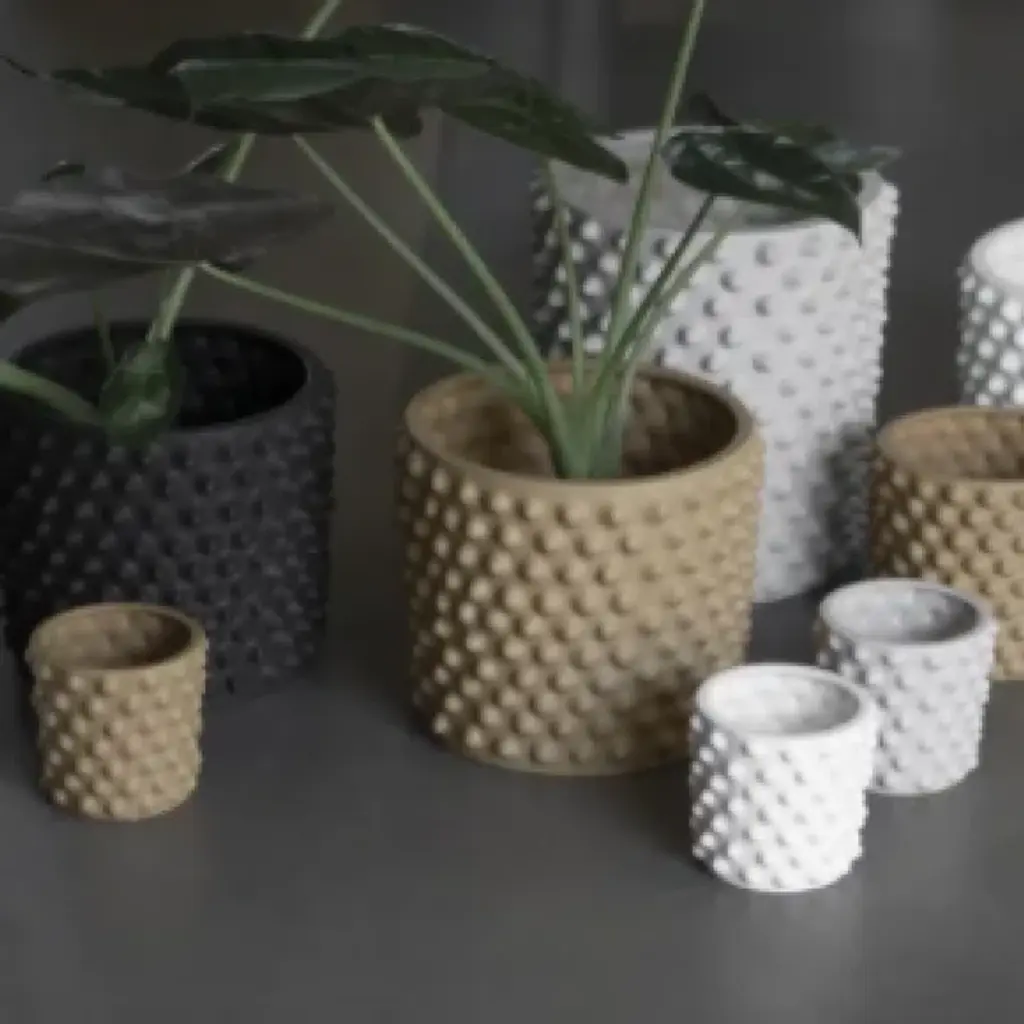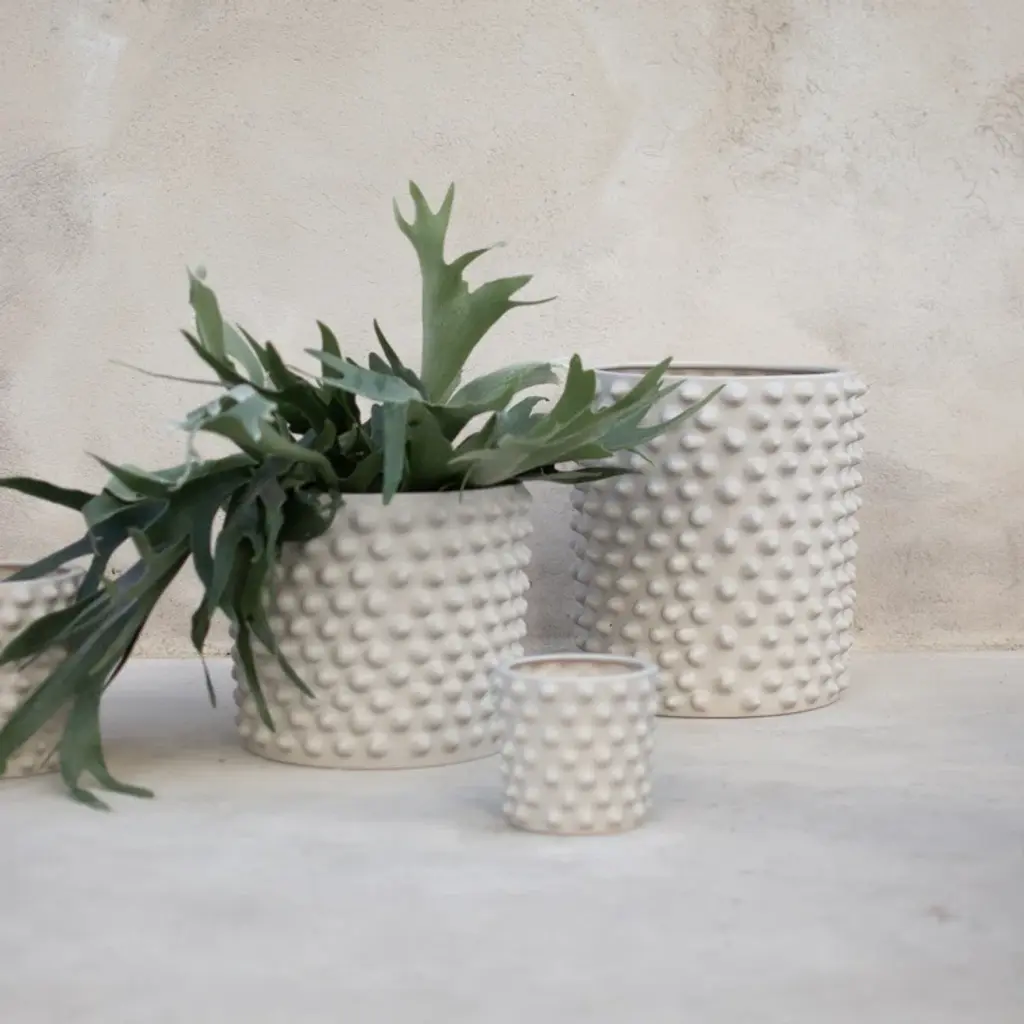 Ceramic pot of Scandinavian design with a knobby, matte surface, except for dusty pink which is glossy.