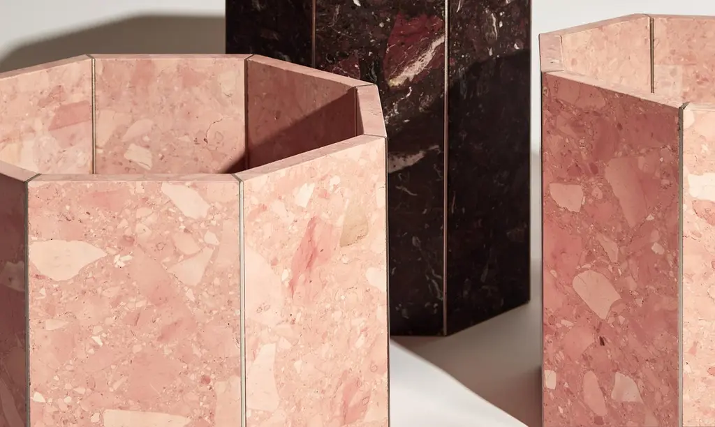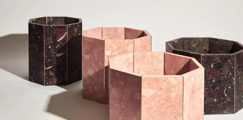 The pieces follow the Narcissus vases in Rosa Perlino and Rosso Levanto shown at David Gill Gallery in November 2017 and are made from these two traditional Italian Terrazzos in their bold colors and stainless steel slats. They have been made in three different sizes ranging between in 35cm and 43cm in diameter and 30cm and 36cm in height. Custom sizes are available.