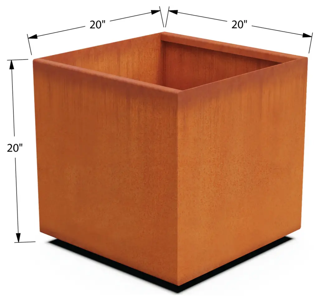 Planters are more than just a vessel for your live accents. As an essential element of your interior and exterior design scheme, planters express style and reflect your creative vision, adding to the perceived image of who you are as a company, organization, or individual.At Plantercraft, we pride ourselves on delivering high-quality, trend-conscious designs fit for the modern world. We understand that style is in the details, and we''ve built our business around the transformative power of a well-chosen architectural piece.Plantercraft is committed to producing high-end commercial and residential planters for dynamic indoor and outdoor spaces. We use durable materials to create unique pieces that last a lifetime.Each piece we produce is made to withstand the extreme wear and tear of everyday weather exposure, preserving your investment for many years to come. From hotels and shopping malls to outdoor beer gardens and restaurants, our designs help create spaces that attract and delight the modern consumer.Specifications • Made in the USA• Size - 20"L x 20"W x 20"H • Material - Corten Steel• Material Thickness - .125" • Weight - 70 lb.• Cubic Feet - 4.5• Gallons - 34