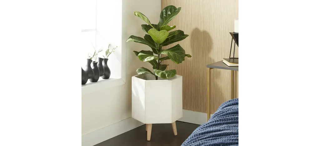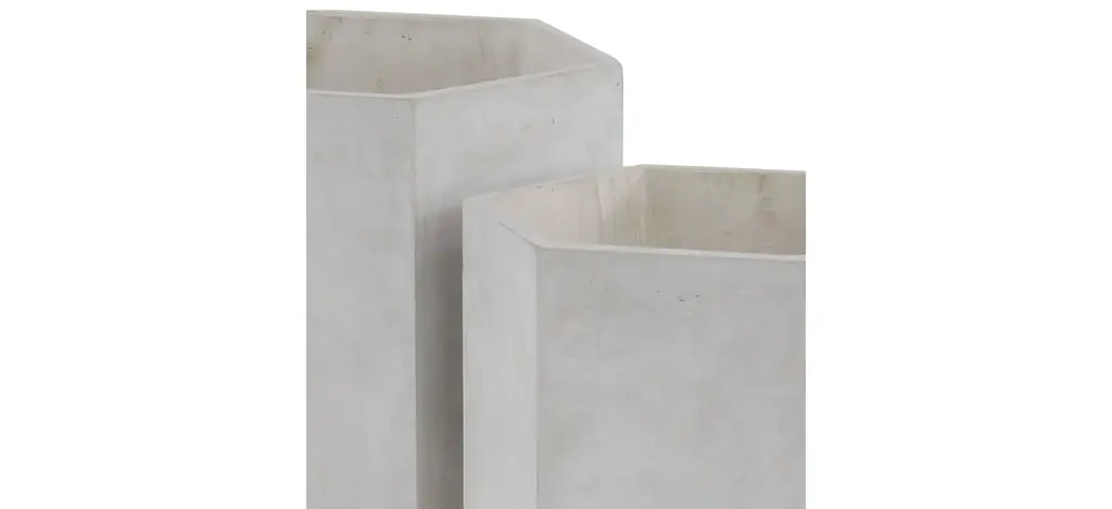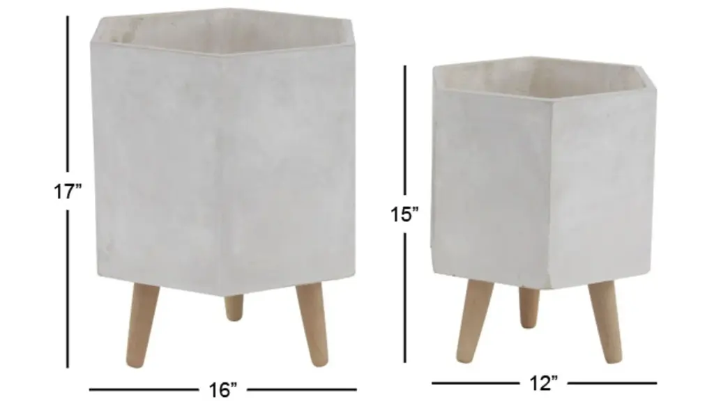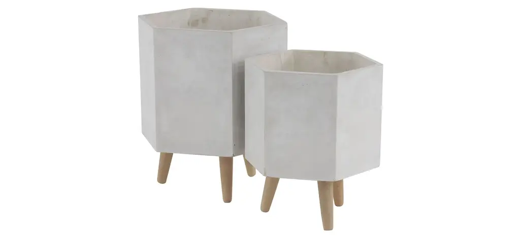 The CosmoLiving Jazz Planter Set of 2 is so cute it hurts. Equipped with three short, mid-century legs, these planters feature hexagonal bodies in a distressed matte finish. Crafted from ceramic fiber clay with beech wood legs, the wide mouth and deep setting of these planters can hold your biggest plant beauties stylishly! Wipe clean with a dry cloth. Nesting planters that are weather-resistant, safe for outdoors! Suitable for indoor and outdoor use. Pot have no drainage holes.