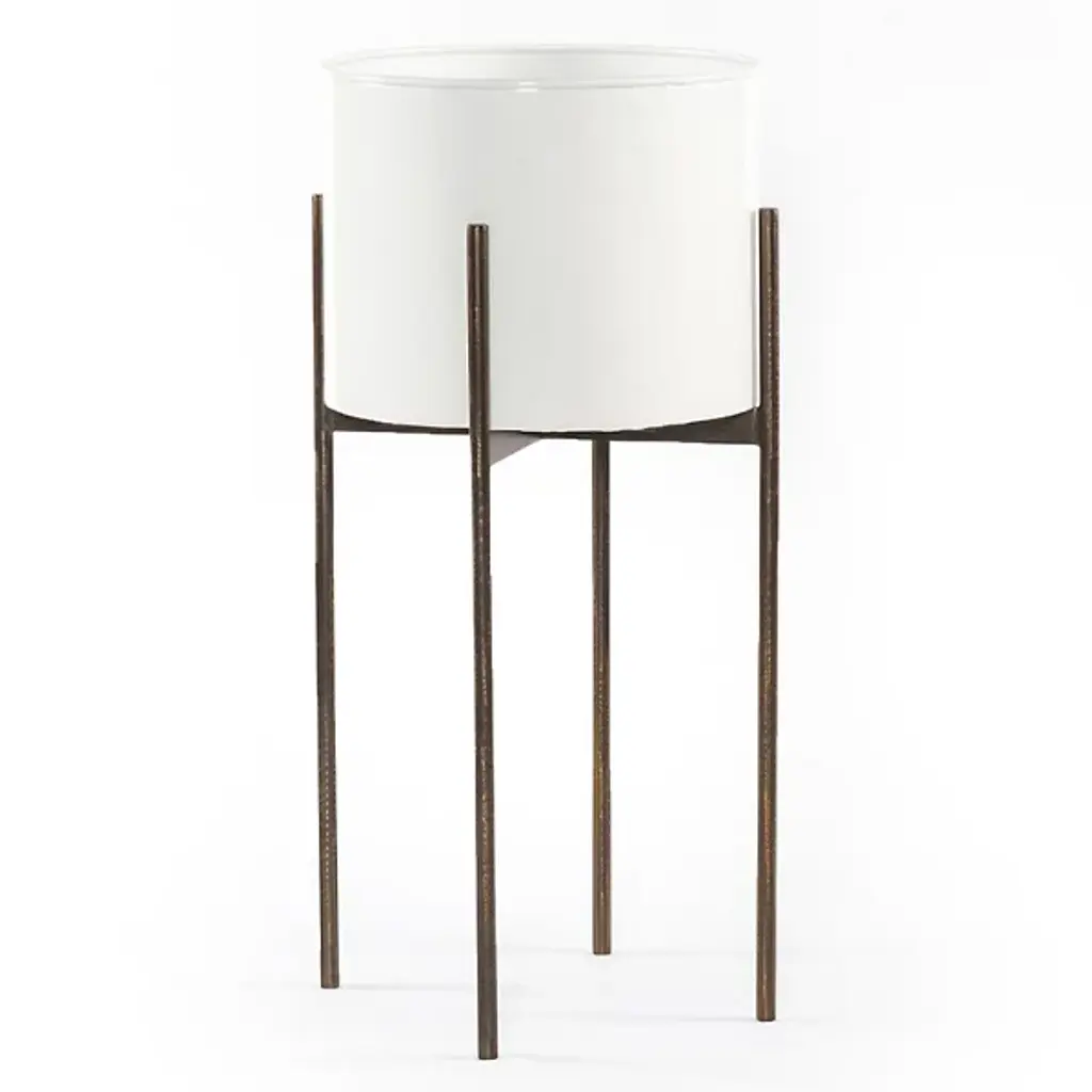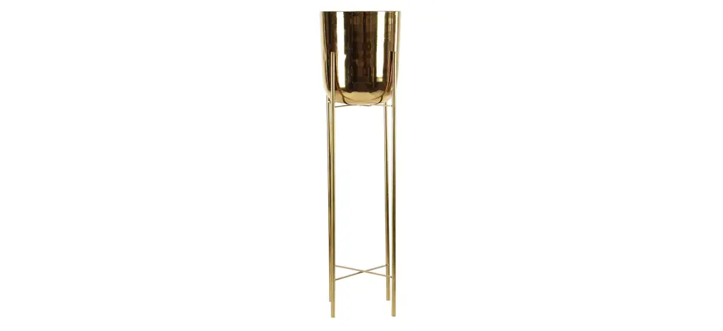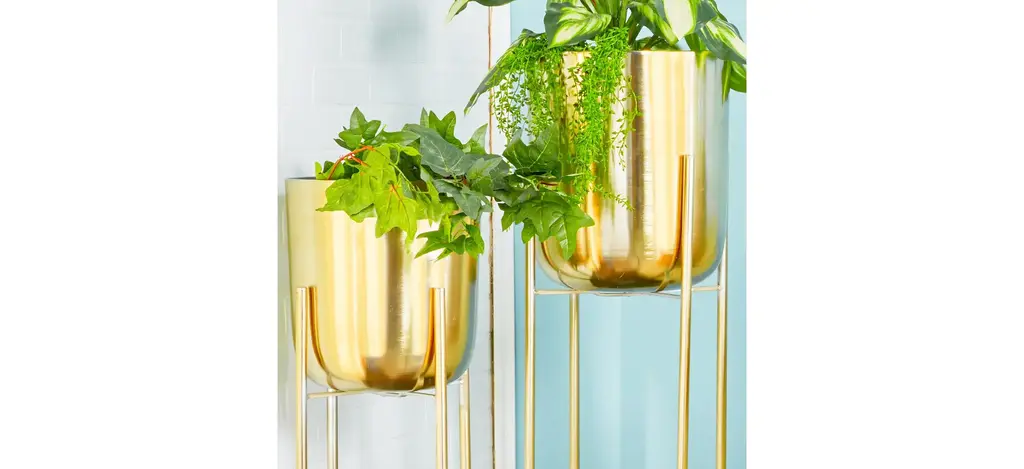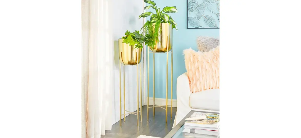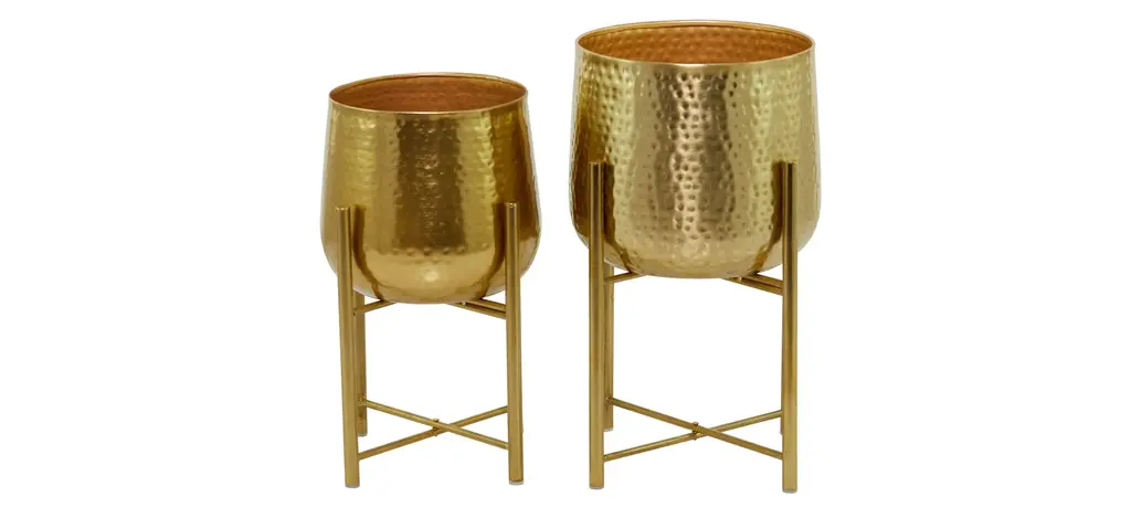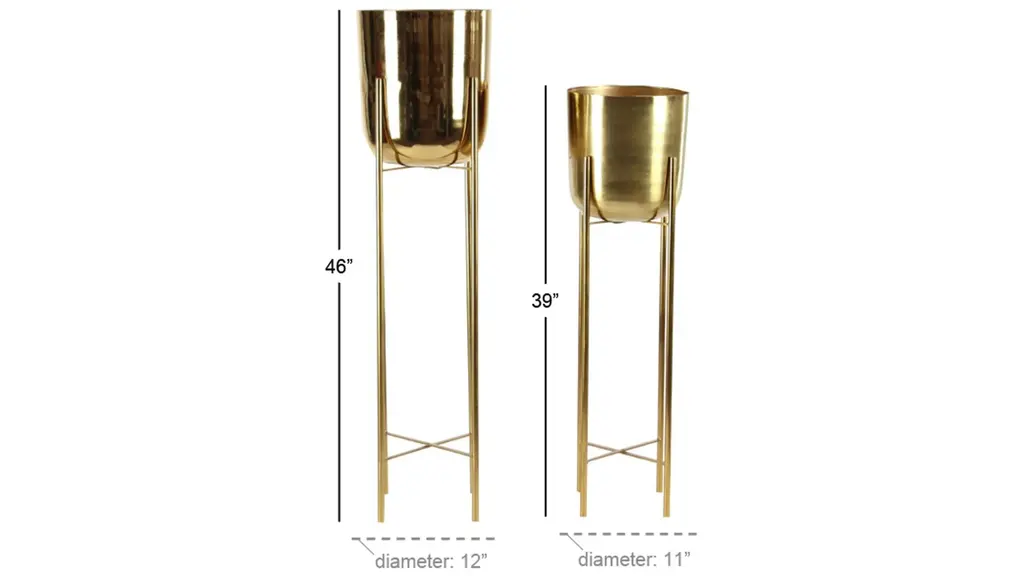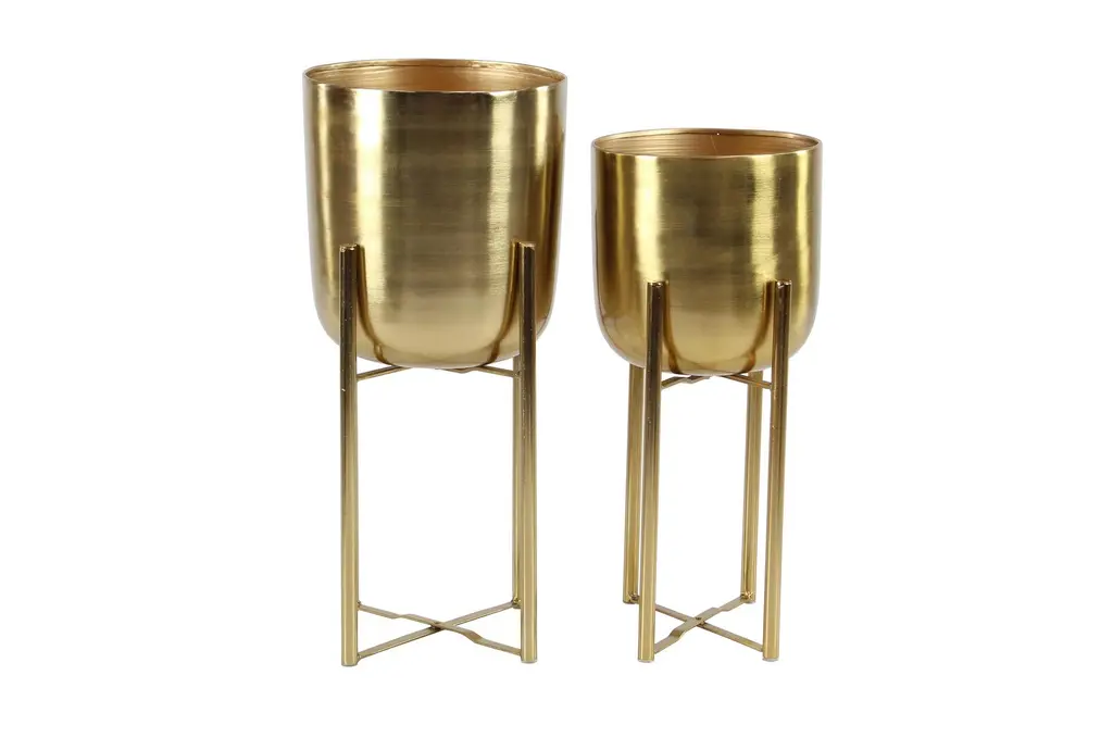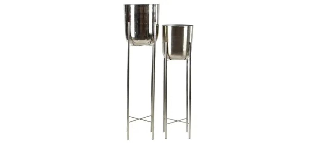 Elevate your plants, literally and figuratively, with this CosmoLiving Stiletto Planter Set of 2 The large round bodies are great for large plants to sturdily sit on the tall metal frames with X-shaped bases. The staggered sizes look chic as a side-by-side set or separate indoor and outdoor for some glam plant looks. Wipe clean with a dry cloth. Suitable for indoor and outdoor use. No drainage holes included.