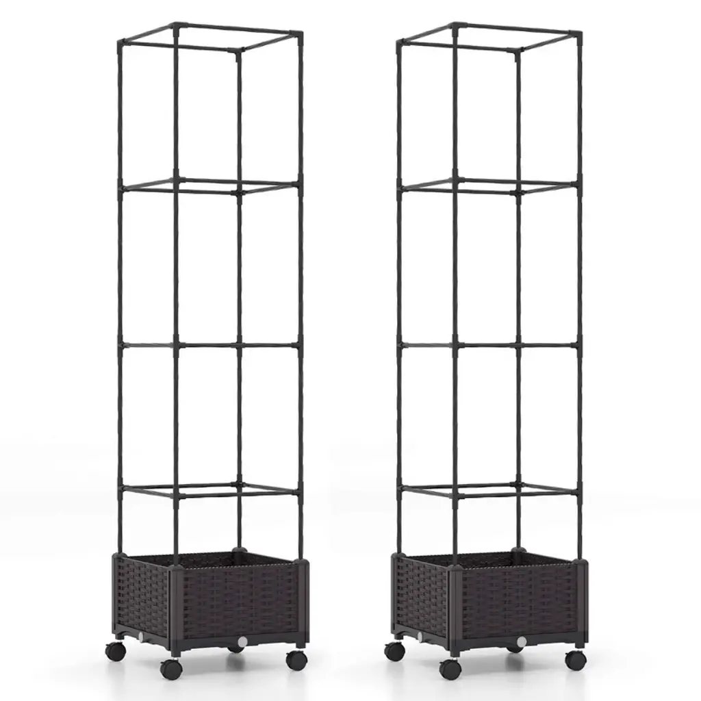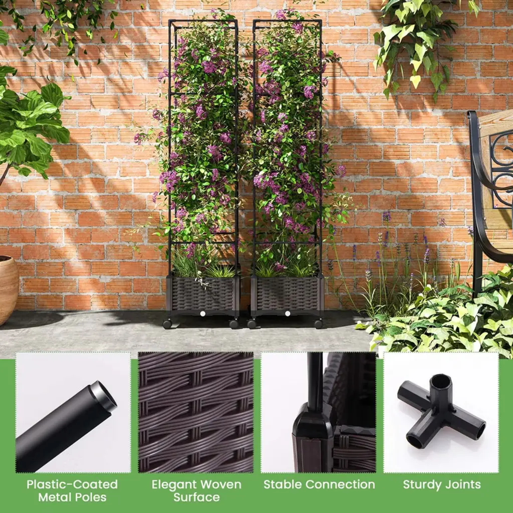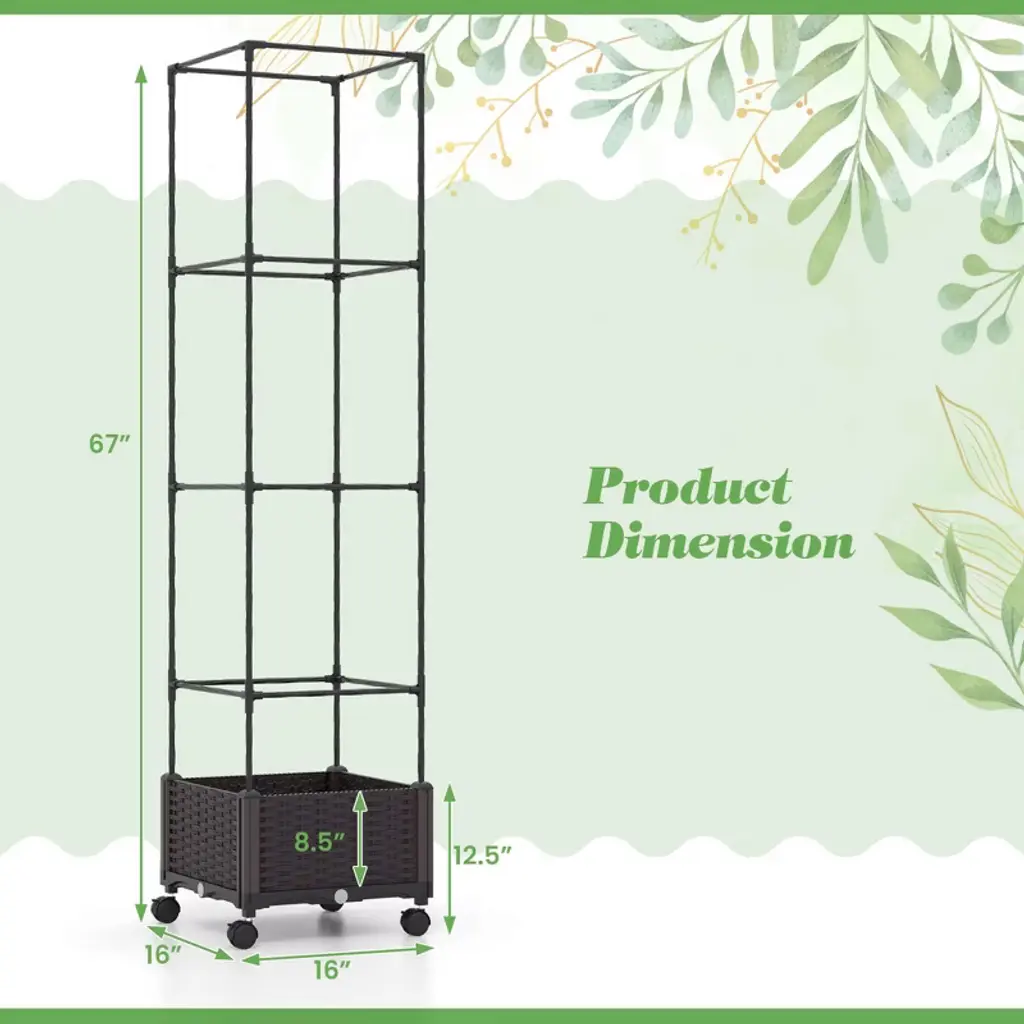 Are you looking for a versatile and efficient solution to elevate your gardening experience? Look no further than our 2-in-1 multifunctional raised garden bed! This product combines a spacious planter box with a sturdy garden trellis, providing ample planting space and vertical support for a variety of climbing plants. Besides, the adjustable trellis height allows for customized growth support, accommodating the needs of different plants, from vegetables and fruits to flowers and herbs. The planter box is equipped with a self-watering system and drainage holes, ensuring optimal water absorption for your plants while preventing water logging. Additionally, constructed with reliable plastic-coated metal poles and sturdy PP panels, this raised garden bed is built to withstand the elements for long-term outdoor use. FeaturesConnect with more than 2 sets to create a larger planting area Suitable for various plants growth including tomatoes, morning glories, peas Self-watering system maintains soil moisture and drains excess water efficiently Detachable design with adjustable heights suits plants in different growth stages Easy movement with lockable wheels for versatile use in various locations Sturdy frame made of sturdy materials with stable connections for longevity Effective drainage system prevents waterlogging and supports healthy plant growth Simple assembly process without the need for tools for quick setup Portable design allows easy relocation between indoor and outdoor spacesColor: Brown+Black Material: PP, Plastic-coated Metal Overall Dimensions: 16" x 16" x 67"(L x W x H) Adjustable Height: 67"/51"/35"/19" Planter Box Size: 16" x 16" x 12.5"(L x W x H) Depth of the Planter Box: 8.5" Net Weight: 7.5/15 lbs Package Includes: 1/2 x Planter Box with Trellis 1 x User’s Manual