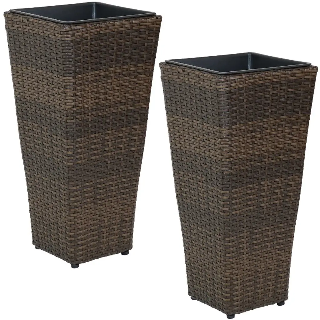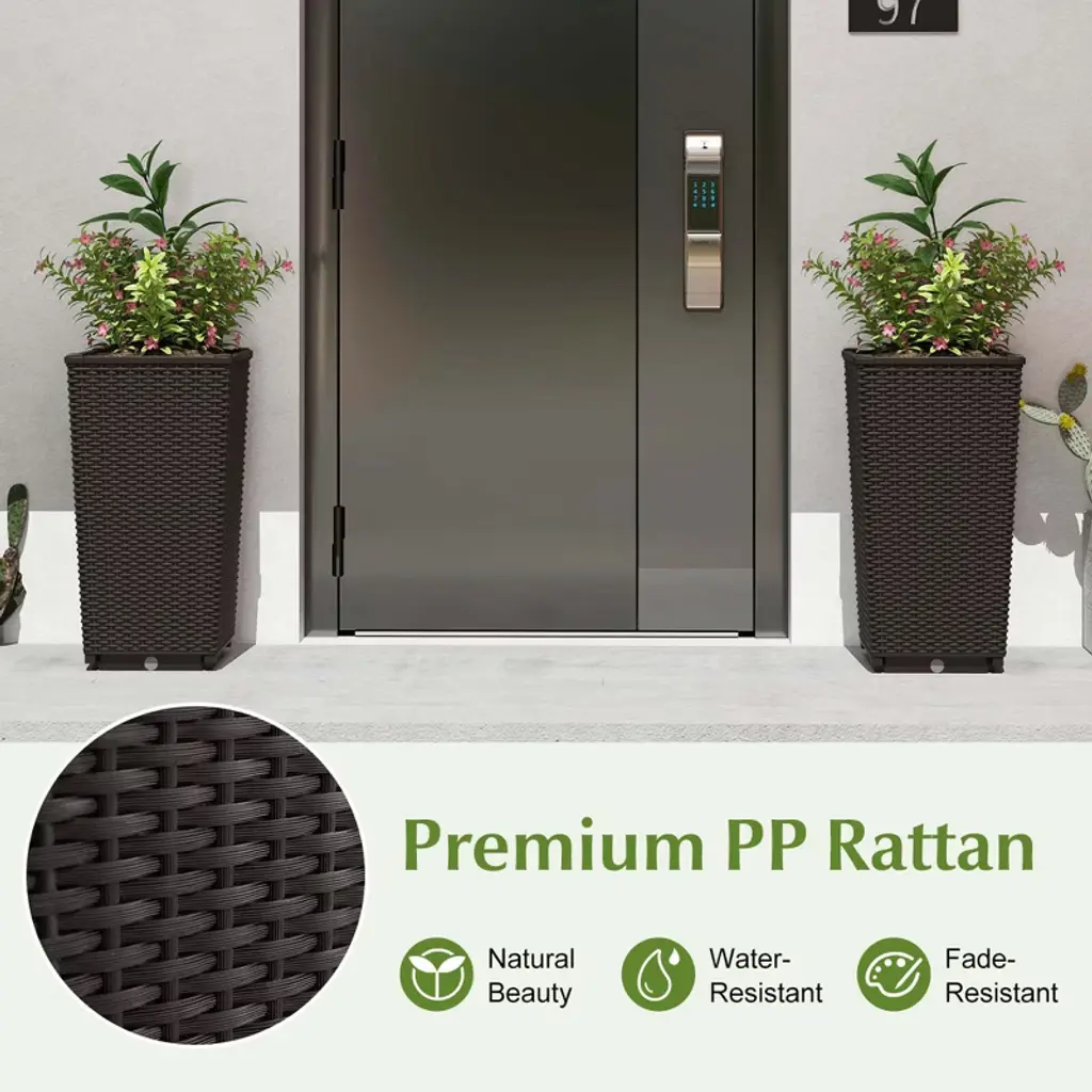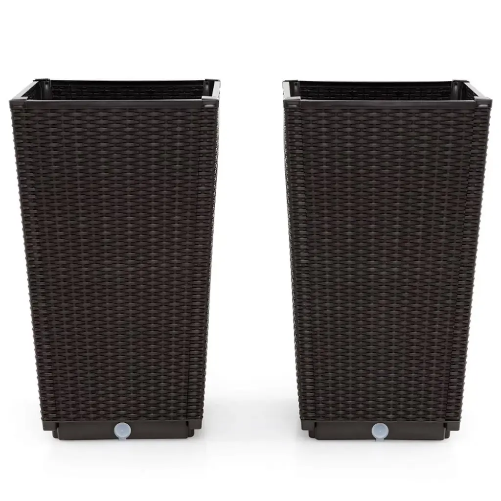 Discover the effortless charm of our tall planters, perfect for enhancing your home, office, or outdoor space with a splash of green. Suited for both budding enthusiasts and gardening veterans, they liberates you from the daily watering routine with its sub-irrigation system, enabling you to enjoy thriving plants with little effort. With their adequate height, these plant pots easily meet a variety of needs from bring your plants closer, concealing the original pots, to growing deep-rooted plants like sunflowers, carrots, or vines and spruces, while their water-resistant PP wicker construction allows for extended use without fearing damage from gardening. Easy to set up in no time, our tall planters are your ideal solution for greening up any space!FeaturesSet of 2 tall planters accommodates large plants with deep roots Self-watering tray keeps plants hydrated with less watering 2 convenient drainage holes helps to drain excess water Crafted from premium PP rattan for long-lasting natural beauty Raised planter design keeps your plants away from animals Ideal both for planting and decorating your flower pots Enhances your space with its convenience and modern style Reinforced at its corners for a strong connection Easy to assemble with detailed user guideColor: Black/Brown Material: PP Product Dimensions: 13" x 13" x 23"(L x W x H) Water Storage Plate Size: 10.5" x 10.5" x 23"(L x W x H) Soil Capacity of Each Planter: 1.5 Cu.ft Inner Dimension: 12" x 12" x 20.5" (L x W x H) Net Weight: 11.5 lbs Package Includes: 2 x Tall Planters 1 x User Guide
