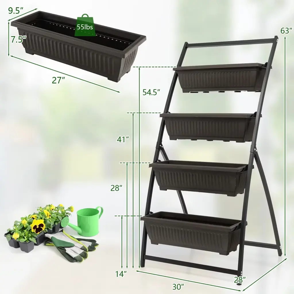 Create a clean and tidy garden with our 4-tier vertical planter box! Whether you want to add a touch of green to your yard or grow your own healthy plants. Our vertical raised garden bed is ideal for you. Its 4-level design makes the plants independent of each other, so you can grow a variety of different plants. In addition, all four planter boxes are easy to remove, allowing you to replant your plants. What's more, the garden bed has a good drainage system, and both the stepped design and drainage holes will facilitate the removal of excess water. And the planter has a stable triangular structure at the bottom, which effectively lowers the center and avoids toppling. At the same time, the sturdy and safe PP material is specially designed to withstand the test of outdoor weather. Besides, the assembly and maintenance of the freestanding elevated garden bed is simple. So whether it's in your backyard, garden or bedroom, our vertical garden bed will stay with you for a long time.Features4 spacious planter boxes is sufficient for a variety of plants Drainage holes prevent water accumulations to promote plants grow Robust heavy metal frame ensures extraordinary stability Selected PP material is waterproof, lightweight and safe Detachable planter boxes enable you to replant the plants easily Vertical design is space-saving and good for plants to receive lights Concise design fits for your yard, patio, balcony, garden, etc Low maintenance is required to maintain the cleaning Easy to set up with easy to follow instruction and complete partsColor: Black+ Brown Material: Metal, PE Overall Size: 30'' x 28'' x 63''(L x W x H) Single Box Size: 27'' x 9.5'' x 7.5'' (L x W x H) Each Box Max Weight: 55 lbs Net Weight: 19 lbs Package includes: 1 x Vertical Garden Raised Bed 1 x Instruction