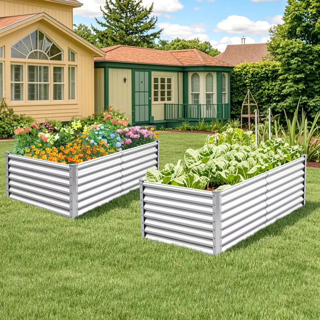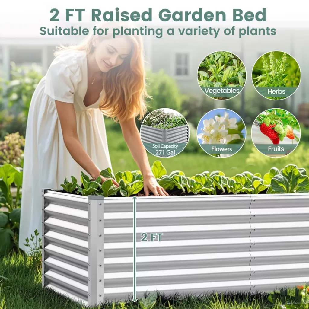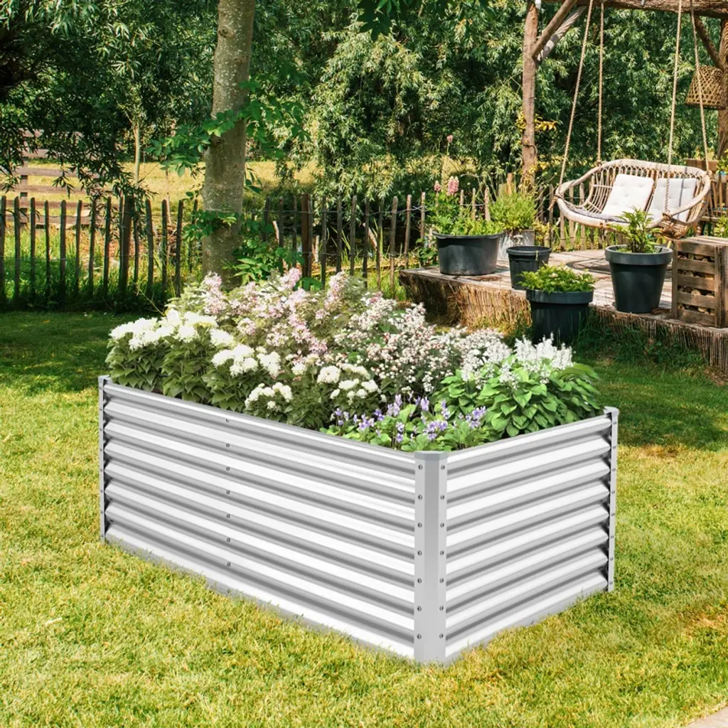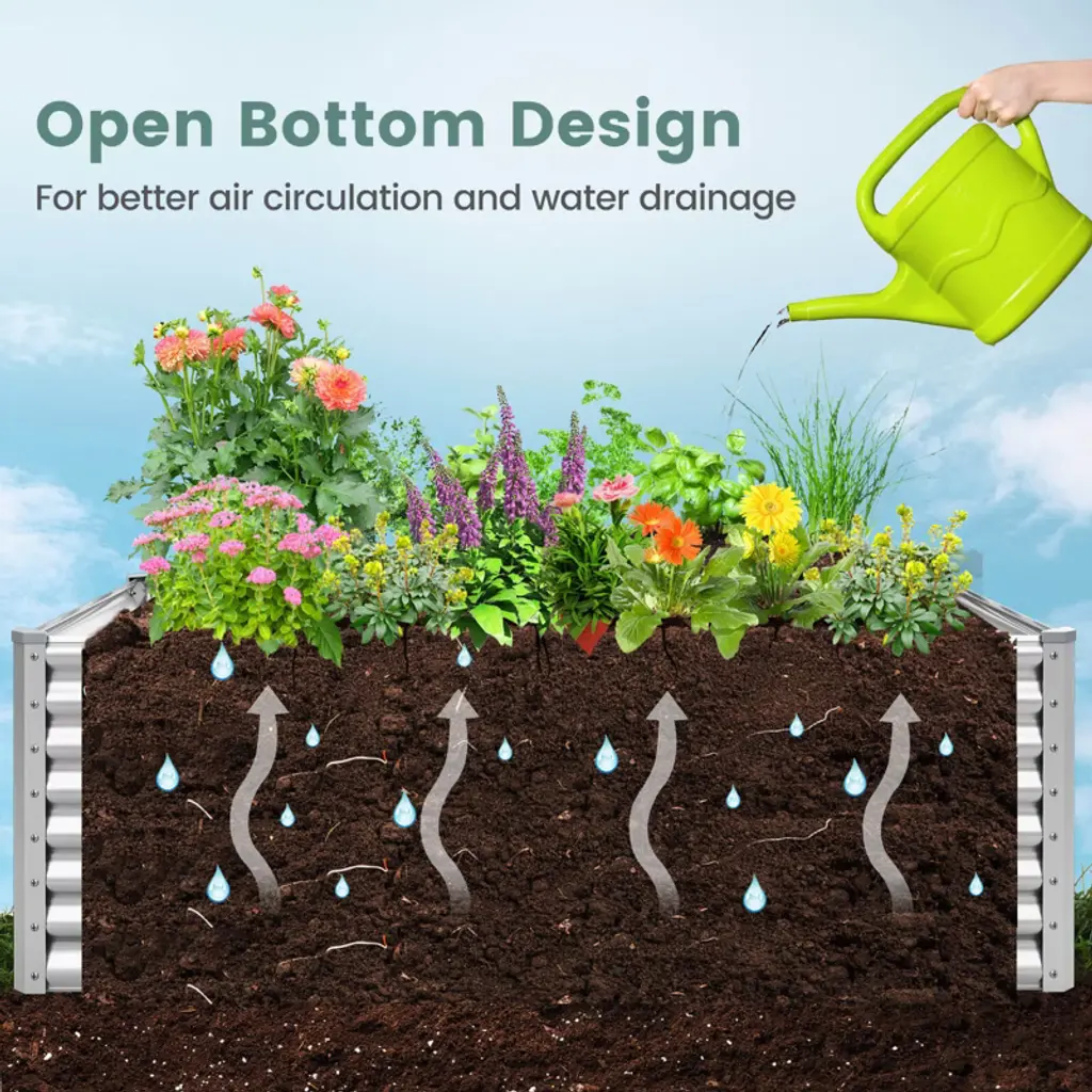 Do you want to create a personal garden? Our raised garden bed is an ideal choice. You can plant herbs, flowers, succulents and veggies in this spacious garden bed, which is bound to add a stylish pop and vibrant atmosphere to your garden, courtyard, etc. Combining sturdy metal panels, reinforced connection, corner protection, this plant box is quite durable and stable. What's more, the bottomless base not only promotes good air and water circulation, but also allows plants to grow deeper in the nutritive earth.FeaturesOffers large space for accommodate a lot of plants Open bottom avoids water drainage while promoting root growth Thickened metal panel and reinforced connection for durability and sturdiness Perfect for planting herbs, vegetables, flowers, etcColor: Silver Material: Metal Overall Dimension: 72" x 36" x 24"(L x W x H) Capacity: 269 gallon Net Weight: 44 lbs Package Includes: 1 x Raised Garden Bed 1 x Instruction