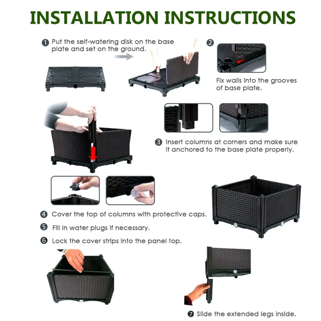The planter bed is a good place to start developing your skills and experience the joys of growing your own plants. Constructed of high-density polyethylene (HDPE), the planter box is solid and weather-resistant to withstand the change of weather. There are 4 planting boxes for you to setup in different shape. The height of garden bed is about 17 inches (include brackets) which can protect your plants from garden animal and pests. With our planter, you don't have to bend over or kneel for long time to grow plants and reduce pain on your back and knee. Elevated garden bed is designed with self-watering disk and drain holes to provide extra space for reserving water and help plants to absorb entirely. It can prevent plant from rot or over-drying effectively. Not only can these garden beds with rattan style help you grow plants, but they also are nice decorations in your outdoor space. It is perfect to put them in your patio, garden and balcony. FeaturesHigh-density polyethylene is sturdy and not easy to be deteriorated by weather Drain the extra water with plugs on the four sides of planter Self-watering disk ensures oxygen and water to penetrate into roots completely Lightweight design of planter for moving to other place easily Perfect for growing vegetables, flowers and herbs Create different shape with our four planter boxes Don't need to bend or squat for long time to plant Great decor for your patio, garden, balcony and yard Easy to assemble according to instructions without other toolsMaterial: Reinforced PP materials Color: Brown, Black Dimension of Planter (Include Leg): 16'' L x 16'' W x 17.5'' H Height of Leg: 7'' Weight of 4 Planters: 17 lbs Weight Capacity of per Planter:45Lbs Package include: 4 x Self-watering Disks 4 x Base Plates 16 x Walls 16 x Safety Heads 16 x Water Plugs 32 x Columns