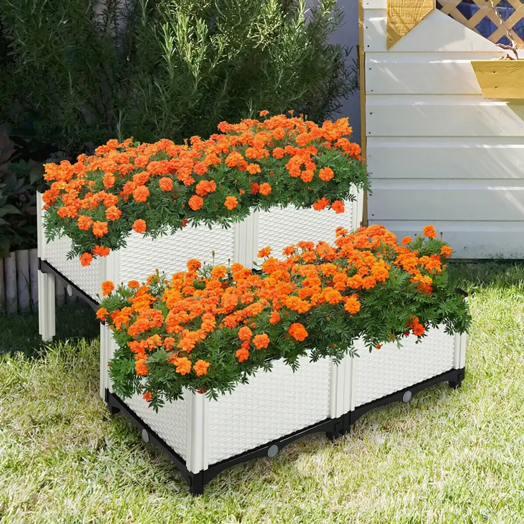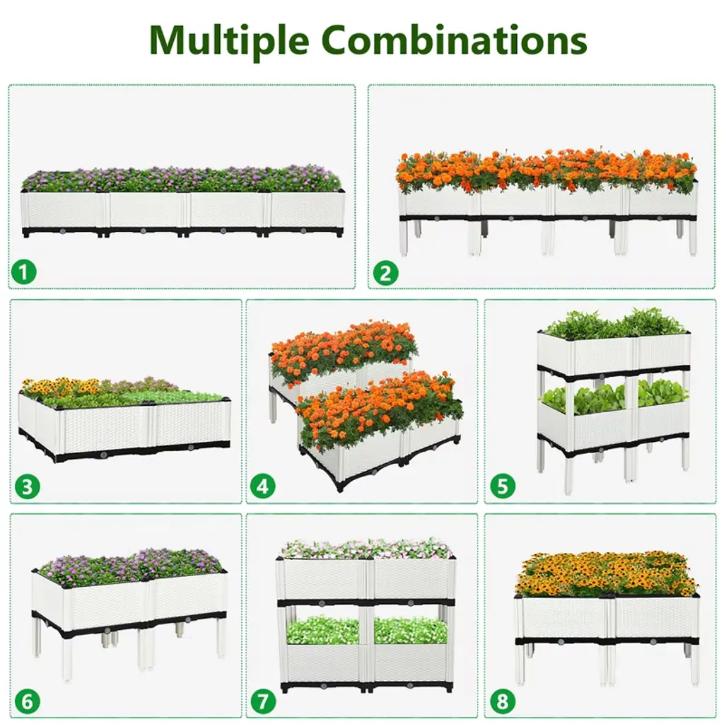 The planter bed is a good place to start developing your skills and experience the joys of growing your own plants. Constructed of high-density polyethylene (HDPE), the planter box is solid and weather-resistant to withstand the change of weather. There are 4 planting boxes for you to setup in different shape. The height of garden bed is about 17 inches (include brackets) which can protect your plants from garden animal and pests. With our planter, you don't have to bend over or kneel for long time to grow plants and reduce pain on your back and knee. Elevated garden bed is designed with self-watering disk and drain holes to provide extra space for reserving water and help plants to absorb entirely. It can prevent plant from rot or over-drying effectively. Not only can these garden beds with rattan style help you grow plants, but they also are nice decorations in your outdoor space. It is perfect to put them in your patio, garden and balcony. FeaturesHigh-density polyethylene is sturdy and not easy to be deteriorated by weather Drain the extra water with plugs on the four sides of planter Self-watering disk ensures oxygen and water to penetrate into roots completely Lightweight design of planter for moving to other place easily Perfect for growing vegetables, flowers and herbs Create different shape with our four planter boxes Don’t need to bend or squat for long time to plant Great décor for your patio, garden, balcony and yard Easy to assemble according to instructions without other toolsMaterial: Reinforced PP materials Color: White Dimension of Planter (Include Leg): 16'' Lx 16'' Wx 17.5'' H Height of Leg: 7'' Weight of 4 Planters: 17 lbs Weight Capacity of per Planter:45Lbs Package include: 4x Self-watering Disks 4x Base Plates 16x Walls 16x Safety Heads 16x Water Plugs 32x Columns