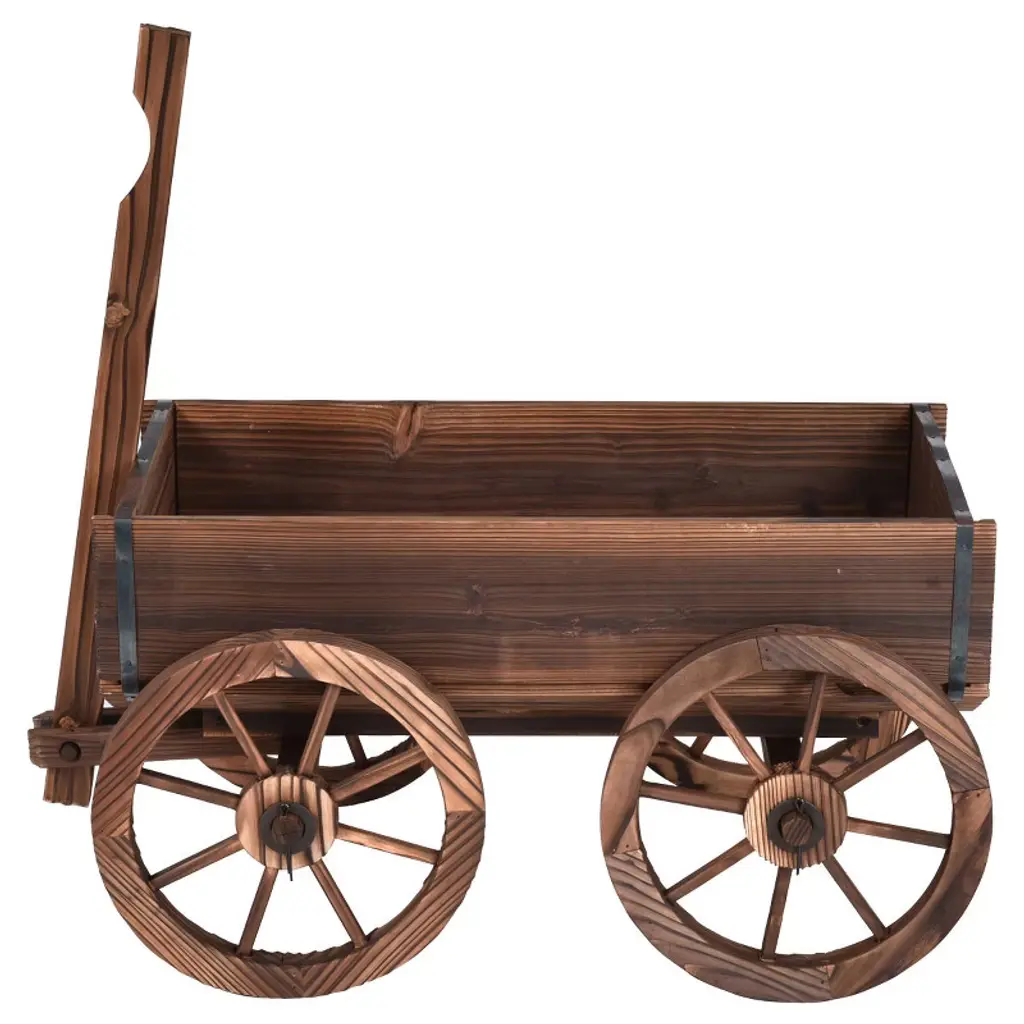 Our wooden wagon cart is a kind garden planter. With its rustic design and antique look, you will complement your outdoor decor. The fir wood construction and burn finish will give you the style you have been looking for in your garden. Its four rolling wheels will help you move it easily. The width and long length of the wagon cart will securely hold your plants in place. Welcome!FeaturesA kind garden planter for planting flowers and plants.With rustic design and antique look, a decoration to the outdoor living space.Solid fir wood construction, sturdy and sturdy.With four wheels for easy moving.Wide enough for hold your planters.Material:fir woodOverall dimension:47''x17.0''x21.0''(LXWXH)Inner size of Cart dimension:24.5''x12.0''x7''(LXWXH)Handle dimension:25.6''; Diameter of wheels:11.8''Product weight:10lbsPackage include:1 x wooden wagon cart