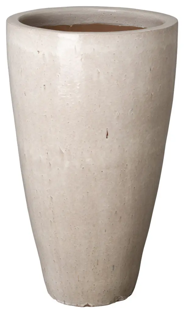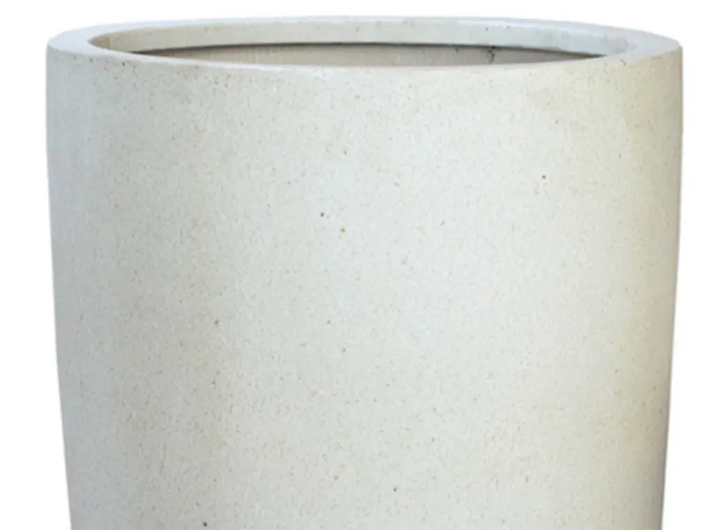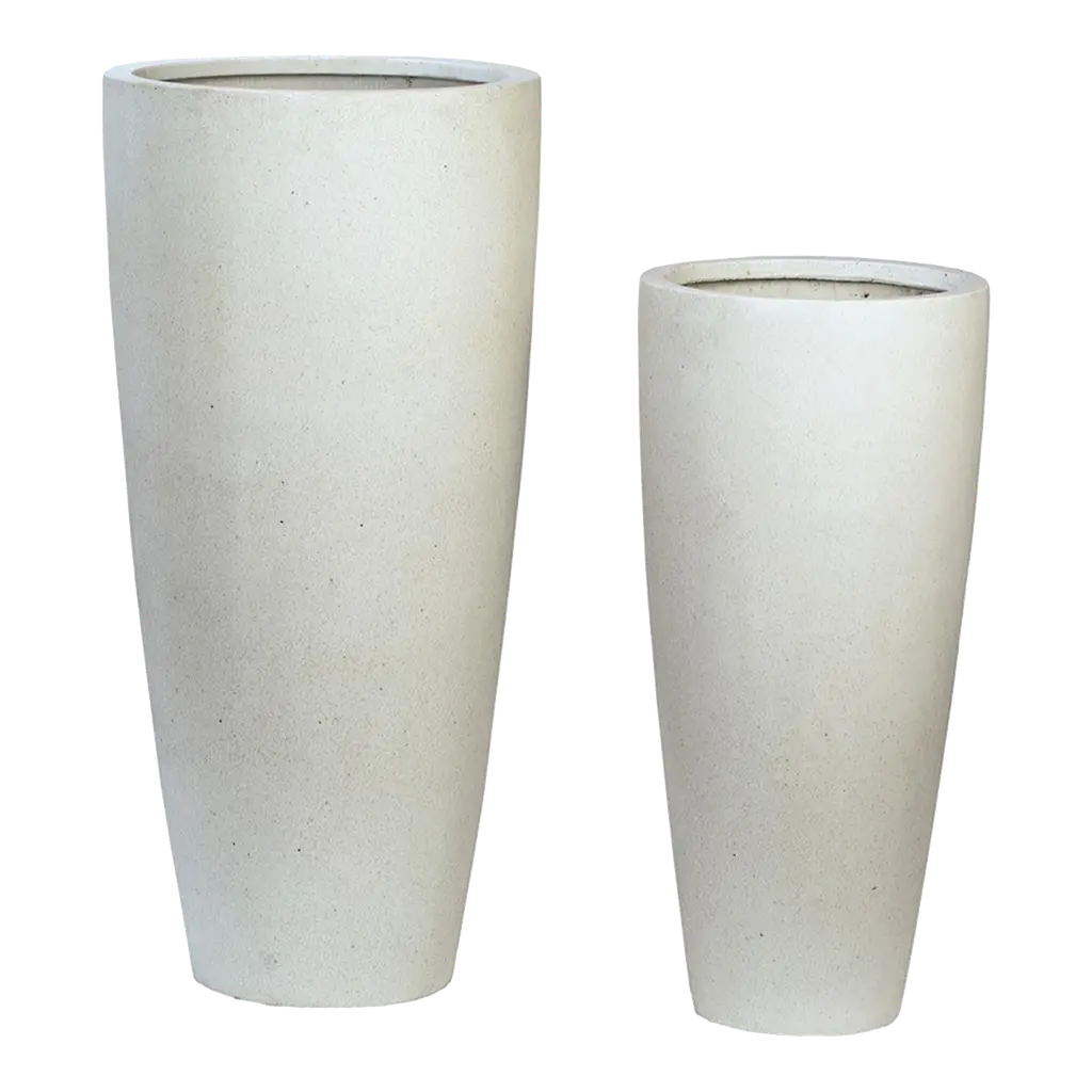 Narrow round fiberstone planter set of two. Beautiful light terrazzo cream tone. Perfect for outdoor or indoor use - waterproof and frost resistant and lightweight material. Each will have slight variations in exact tones/natural appearance. This item is non-returnable - all sales are final.Large: 19" x 19" x 39" Small: 15" x 15" x 31"