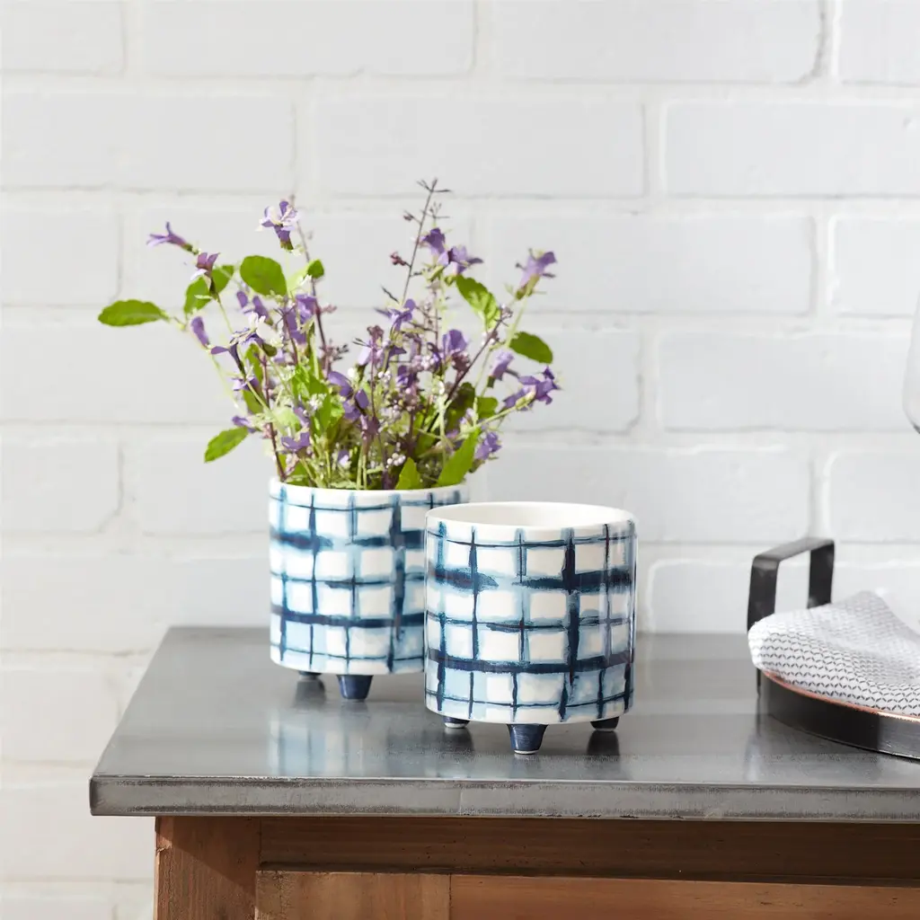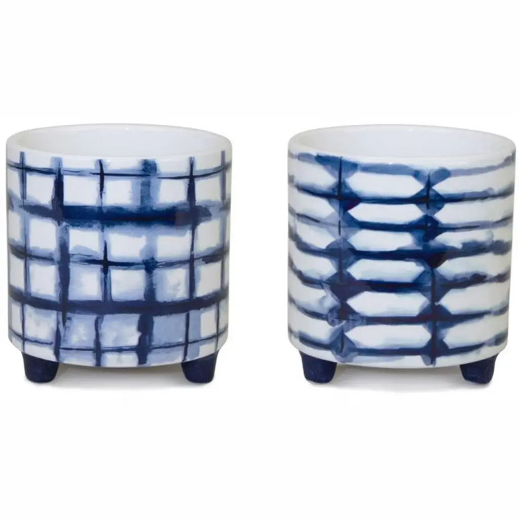 Display your plants in style with this stunning set of Decorative Pots. Featuring two assorted sizes, the deep blue and white hues paired with the criss-cross design makes this set a great addition to your everyday home decor. The quality dolomite composition and glaze finish is sure to last for seasons to come. Complete the look by dropping a faux potted plant or floral arrangement in each pot. Featured in Melrose International's Waterfront collection.