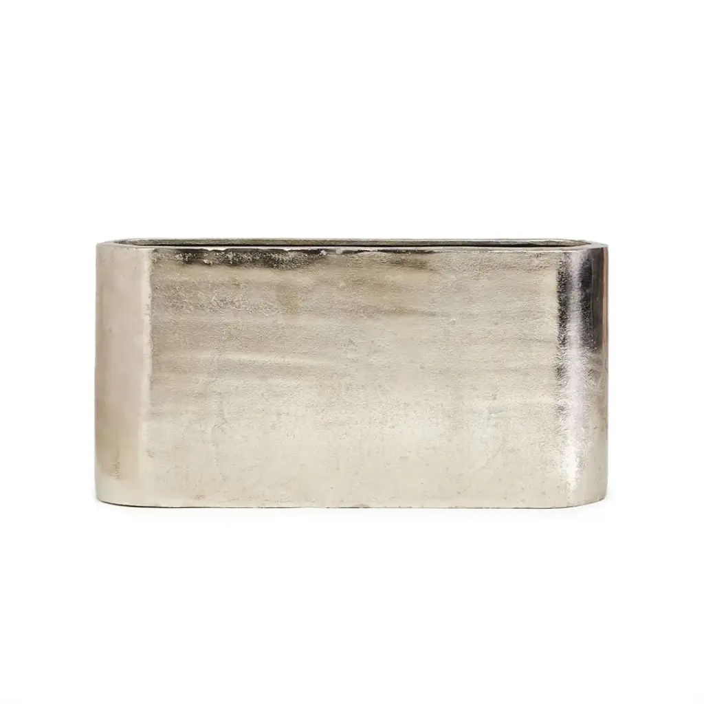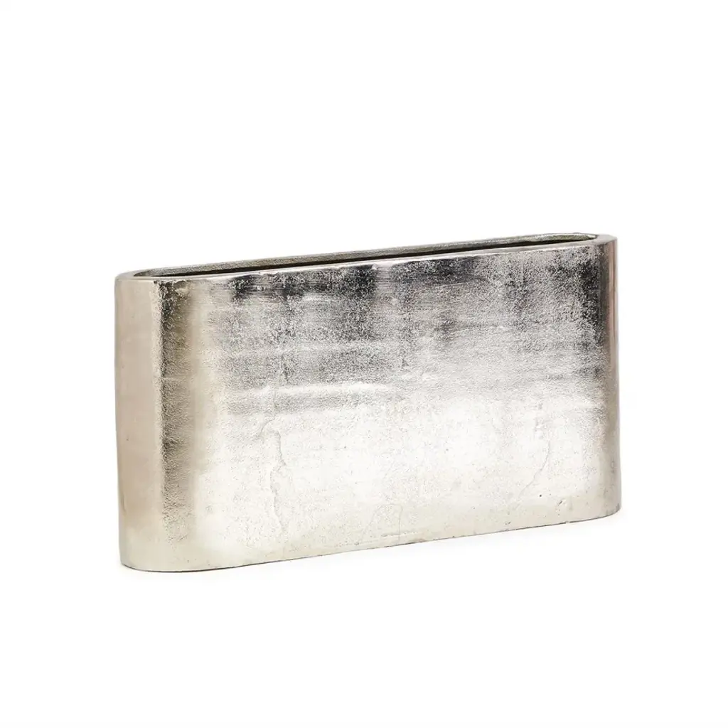 This elongated oval vase is crafted from recycled aluminum, making it earth-friendly without sacrificing its lavishness. The 3" width makes it an easy container to create a impactful floral arrangement. Use with dried flower or branches.