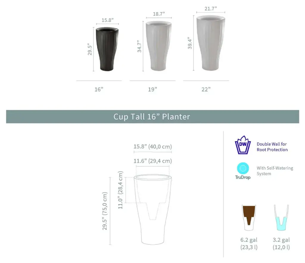 Simple and sleek, the Cup Planter from Crescent Garden makes a lovely addition to your indoor or outdoor gardening area. The double-wall planter helps insulate the roots of your plants when the temperature shifts from cold to hot, preserving the longevity of the plant''s life. Created for the first-time gardener or the savvy enthusiast, the TruDrop system feature allows your plants to better survive the outdoors and can go weeks without watering for phenomenal results. The ingeniously designed reservoir in the planter, which reduces watering frequency and avoids over-fertilizing, is an innovative environmental solution for container gardening. This 100% recyclable and food-safe container is resistant to chipping, fading and mildews, resulting in healthier plants and more efficient gardening. The Crescent Garden''s TruDrop One self-watering planting pots are available in a great variety of colors, sizes and styles. Using quality materials that are backed by a 10-year warranty, these lightweight planters are known for their durability, designed to withstand extreme weather, and made to last. SELF-WATERING: Go weeks without watering and the easy-to-read water-level indicator lets you know the right time to fill the reservoir. This ingeniously designed reservoir also keeps fertilizer contained. UNIQUE DRAINAGE: This indoor / outdoor planter includes a pre-drilled drainage hole for healthier plant growth. When using the plant pot outdoors, remove the red waterproof plug. A hidden overfill tube drains out excess rainwater, ensuring the plants'' longevity. Matching saucers sold separately. LIGHTWEIGHT AND STURDY: Constructed with 100% recyclable rotation molded polyethylene, making it lightweight, chip-resistant and durable.WEATHER RESISTANT: The weather-proof planter structure ensures the planter won''t fade or crack during extreme temperatures. WARRANTY: 10-year limited warranty FOOD-SAFE: Constructed with eco-friendly material to grow your favorite herbs and edibles. Inner dimension: 15.75"W x 29.53"H / Holds 6.16 gal soil + 3.17 gal water