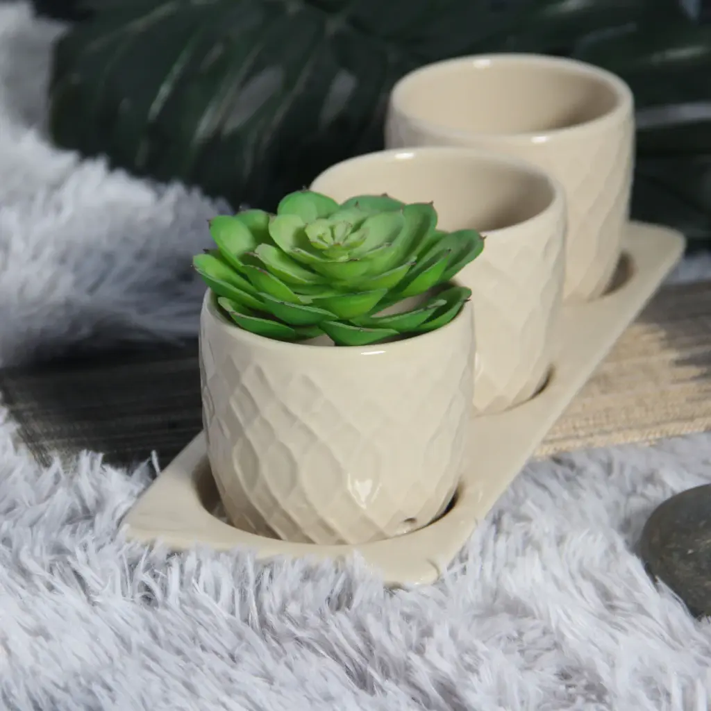 The Gerbera Ceramic Planter Set with Disk is the perfect way to add a touch of sophistication to your indoor plant collection. Crafted from high-quality ceramic material, this unique planter set features many colors and finishes that add a subtle elegance to any room. The ceramic disk of this pot set makes it easier to water your plants and keep them healthy, keeping your space cleaner and easy to move. If you are finding to showcase your favorite succulents or add a touch of greenery to your living space, this indoor ceramic planter will be suitable for you. Its sleek and minimalist design is perfect for any modern or traditional home decor, and its durable construction ensures that it will last for years to come. So why wait? Elevate your home decor game and add this unique ceramic pot to your collection today!