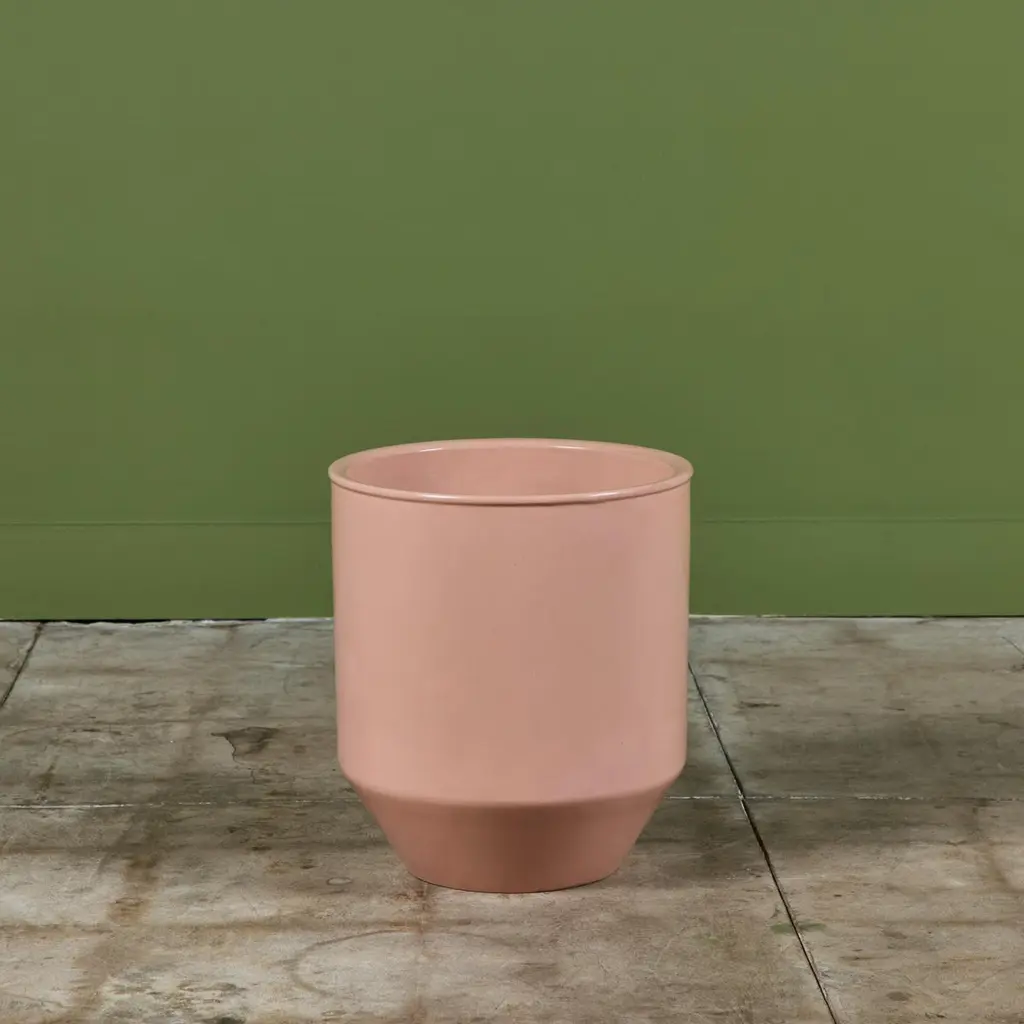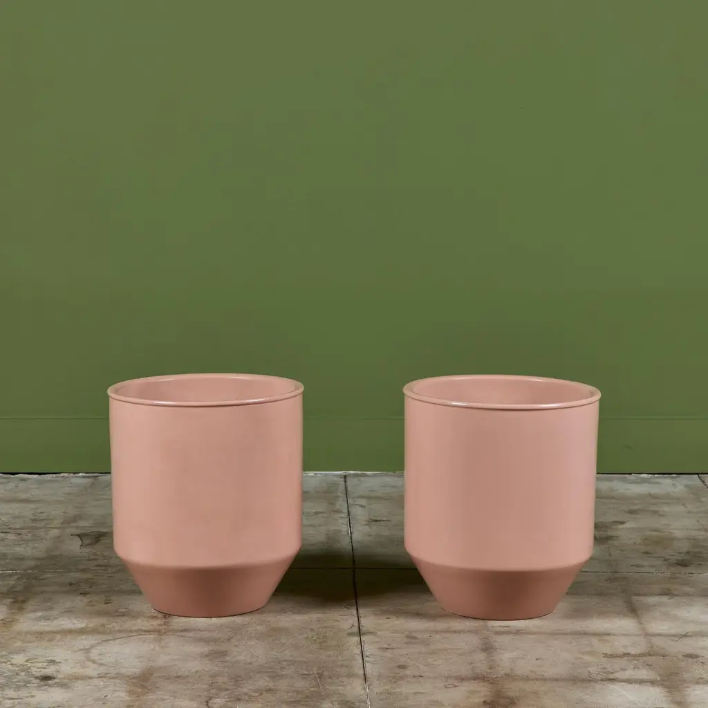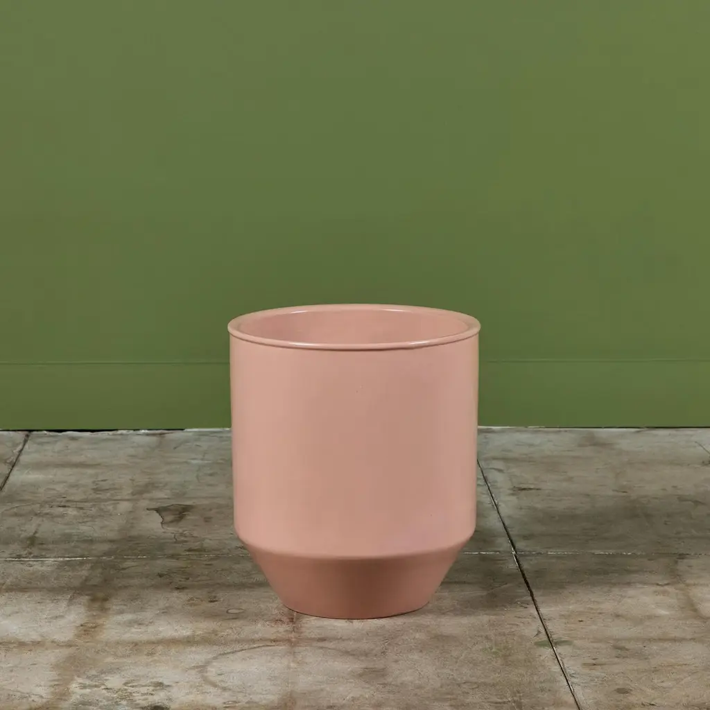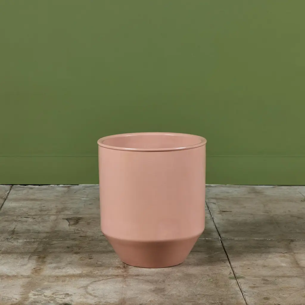 Bullet planter by David Cressey from the Pro/Artisan collection for Architectural Pottery. The planter is finished in a 'millennial pink' glaze. The top of the planter has slightly bowed sides and a flattened lip while the bottom tappers inwards. Two available. Priced individually.Dimensions15.25" diameter x 17.25" height.ConditionExcellent vintage condition.