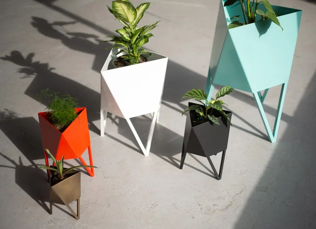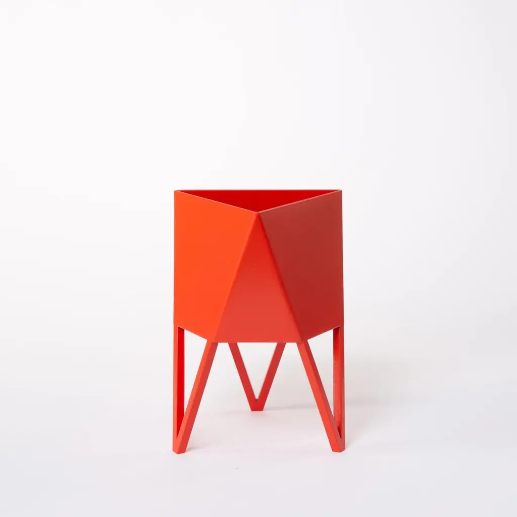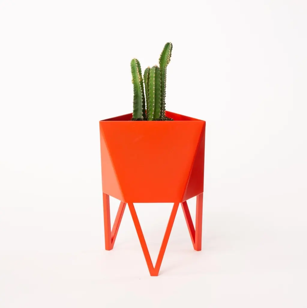 Force/Collide's award-winning signature planter is an ongoing production available in multiple colors and sizes. This original design is a nod to playful perspectives and spatial relationships. Proportions are thoughtful in aesthetic while optimizing function and user flexibility. The potting basin is built with extra volume for plants to grow, while integral legs serve as a built-in stand. The Deca Planter is an elevated home accent for plant lovers with refined craftsmanship and bold personality.The Deca Planter comes in a powder coated finish that offers bold color accents as well as protection against corrosion. Available in four sizes and five colors, optional drainage holes are integral to the design, (sealing plugs provided with purchase). Plants can be potted directly or easily exchanged if kept in nursery pots. We build all Deca Planters by hand in small quantity batches in the Force/Collide studio.Mars is a stark orange-red with zero gloss and a bit of texture. This color reads as vibrant and bold in the daylight and moody canyon red in low light.Force/Collide received a Carol Duke Artist Award of Excellence from Bellevue Arts Museum at Arts Fair in 2018 and again in 2021 for the Deca Planters. They have been selected for exhibits at American Design Club for NY Design Week, 1stdibs Gallery and WorkOf.