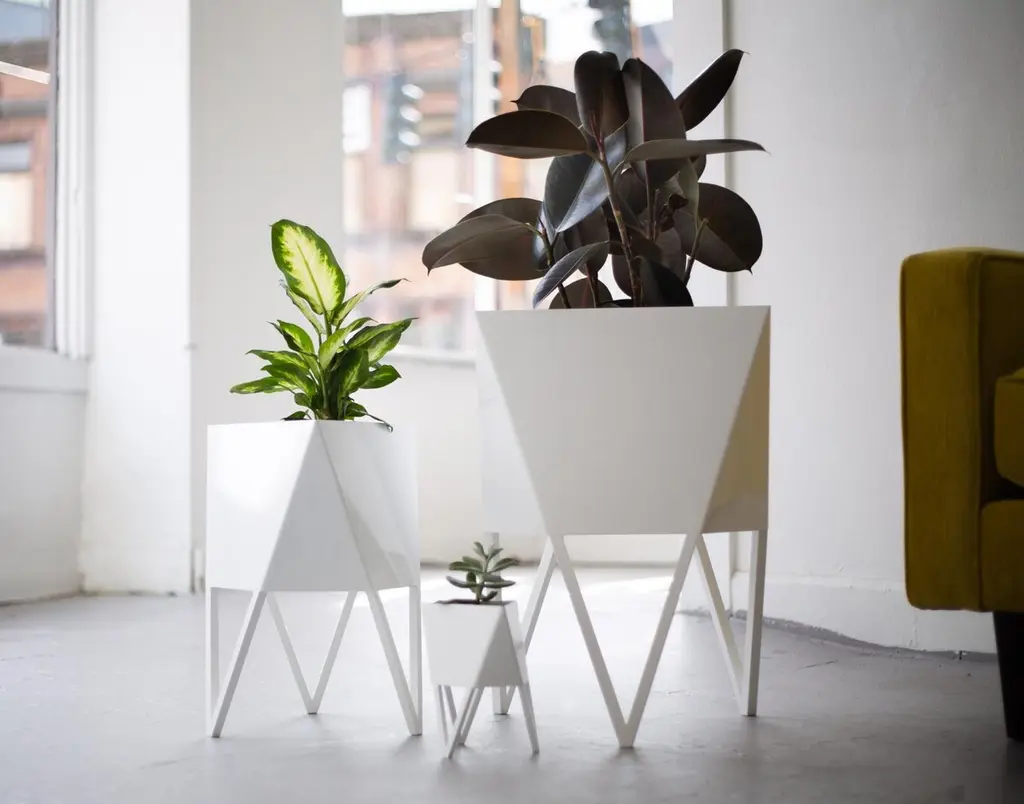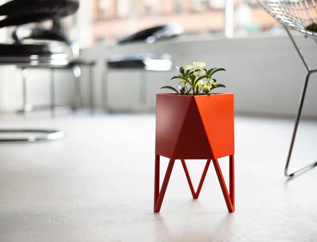 Force/Collide's award-winning signature planter is an ongoing production available in multiple colors and sizes. This original design is a nod to playful perspectives and spatial relationships. Proportions are thoughtful in aesthetic while optimizing function and user flexibility. The potting basin is built with extra volume for plants to grow, while integral legs serve as a built-in stand. The Deca Planter is an elevated home accent for plant lovers with refined craftsmanship and bold personality.The Deca Planter comes in a powder coated finish that offers bold color accents as well as protection against corrosion. Available in four sizes and five colors, optional drainage holes are integral to the design, (sealing plugs provided with purchase). Plants can be potted directly or easily exchanged if kept in nursery pots. We build all Deca Planters by hand in small quantity batches in the Force/Collide studio.Mineral is a low-gloss shade of warm blue-green.Force/Collide received a Carol Duke Artist Award of Excellence from Bellevue Arts Museum at Arts Fair in 2018 and again in 2021 for the Deca Planters. They have been selected for exhibits at American Design Club for NY Design Week, 1stdibs Gallery and WorkOf.