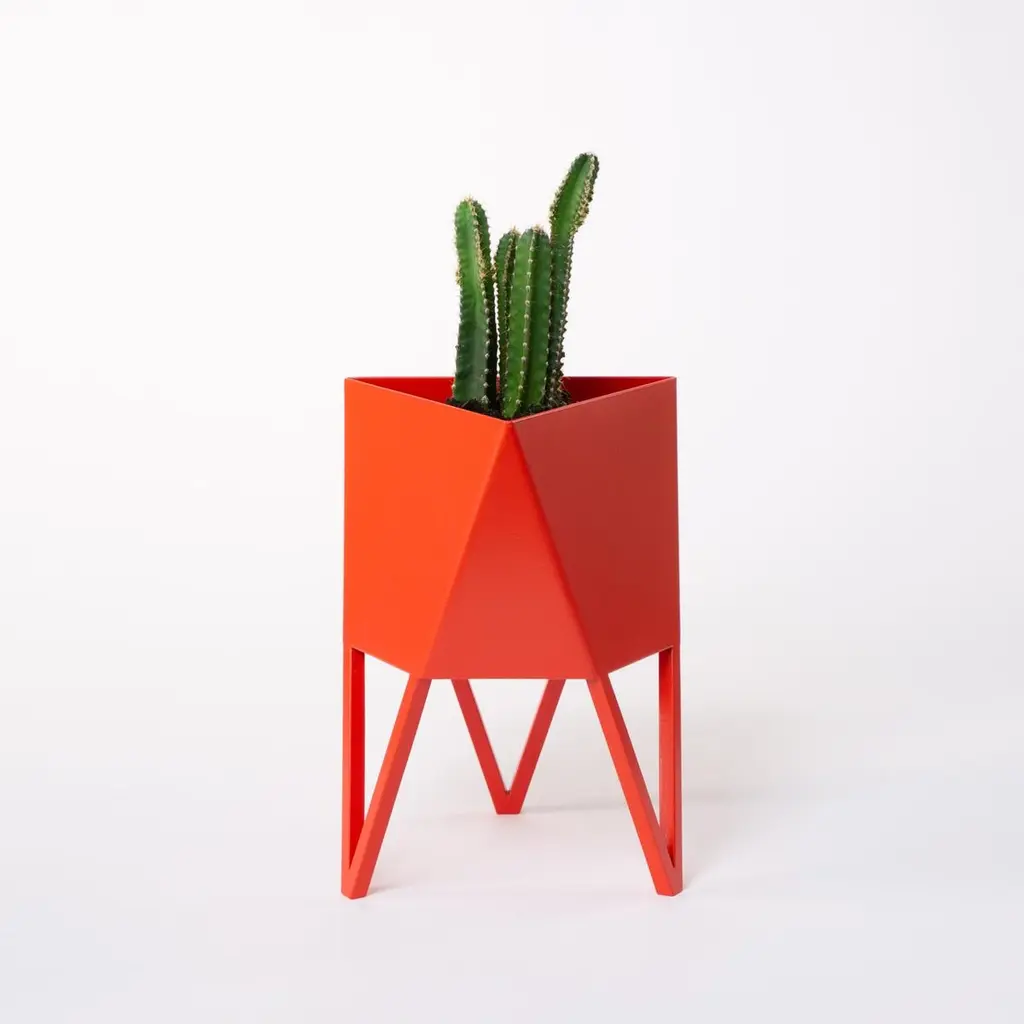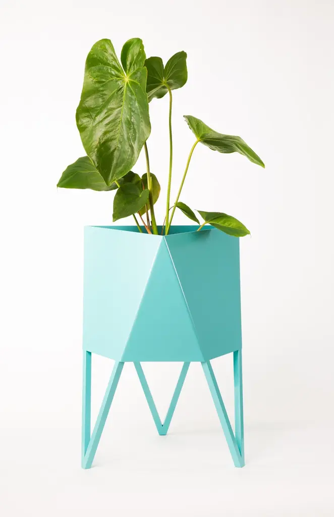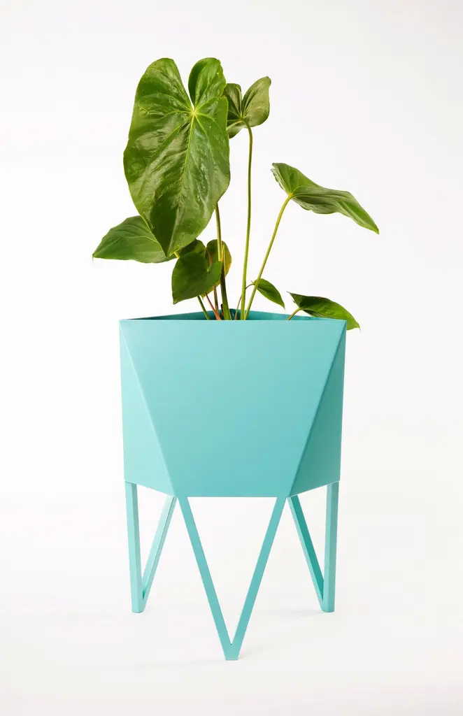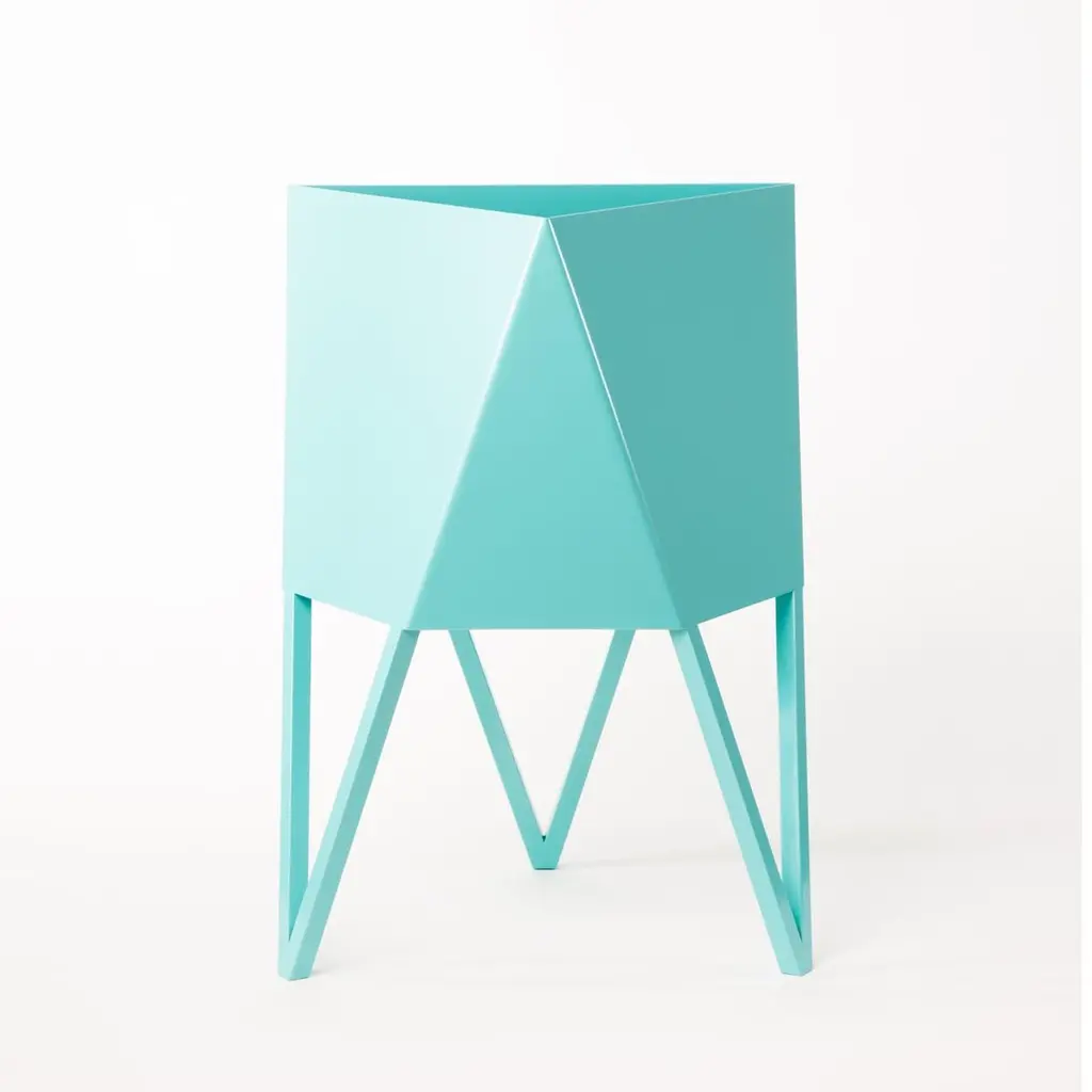 Force/Collide's award-winning signature planter is an ongoing production available in multiple colors and sizes. This original design is a nod to playful perspectives and spatial relationships. Proportions are thoughtful in aesthetic while optimizing function and user flexibility. The potting basin is built with extra volume for plants to grow, while integral legs serve as a built-in stand. The Deca Planter is an elevated home accent for plant lovers with refined craftsmanship and bold personality.The Deca Planter comes in a powder coated finish that offers bold color accents as well as protection against corrosion. Available in four sizes and five colors, optional drainage holes are integral to the design, (sealing plugs provided with purchase). Plants can be potted directly or easily exchanged if kept in nursery pots. We build all Deca Planters by hand in small quantity batches in the Force/Collide studio.Mineral is a low-gloss shade of warm blue-green.Force/Collide received a Carol Duke Artist Award of Excellence from Bellevue Arts Museum at Arts Fair in 2018 and again in 2021 for the Deca Planters. They have been selected for exhibits at American Design Club for NY Design Week, 1stdibs Gallery and WorkOf.
