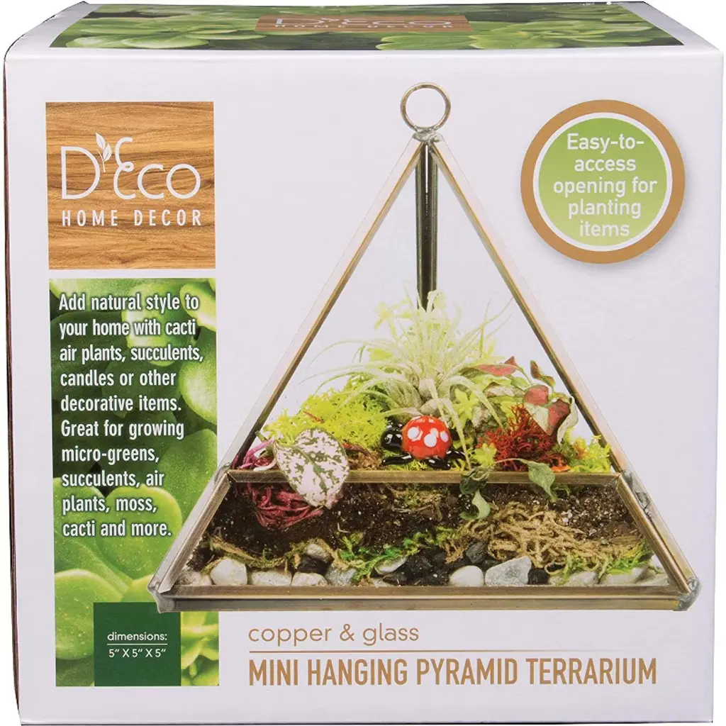 Decorate your space with our modern sleek design terrarium that fits in any decor. It features copper accents for a timeless pop of color! A heavy duty hook and chain is included for you to display your beautiful plants on your porch or anywhere you like! For the green thumb in your life, give them a terrarium that is great for growing micro-greens, succulents, air plants, moss, cacti, and more! Discover D'Eco's innovative and ecological solutions for everyday living, including unbreakable glassware, modern home decor, and stylish lunch containers.