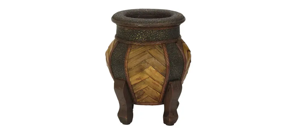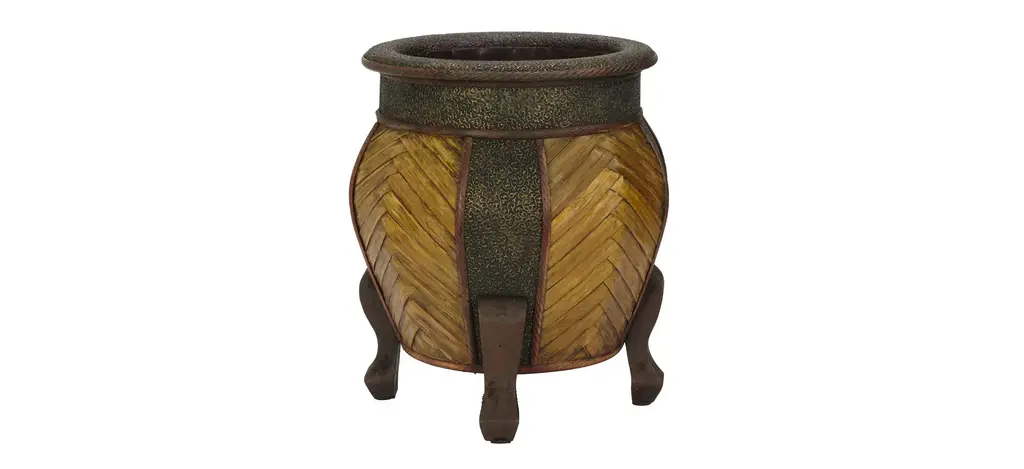 In a set of two (which doubles your decorating possibilities), this Rounded Wood Planter Set is sure to add to any floral arrangement. The 15 inch high and its smaller 10.75 inch sibling are both decorated with upward angled thatch design next to an intricately pressed vine patterned decoration. Each detailed pattern is separated with rope designed trim. Comes on four thick and study cocoa colored legs for stability.
