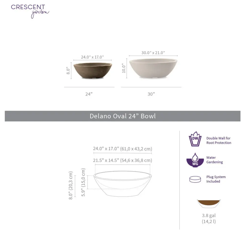 Get creative with this oval planter and transform from tabletop succulent displays to miniature garden displays to water gardens to fountains to wherever your imagination leads you. The double-wall planter also helps insulate the roots of your plants when the temperature shifts from cold to hot, preserving the longevity of the plant''s life. INDOOR/OUTDOOR : Double-walled planter is a perfect indoor and outdoor planting bowl. LIGHTWEIGHT & DURABLE: Constructed with 100% recyclable polyethylene, making it lightweight, chip-resistant and durable. WEATHER-RESISTANT : The weather-proof planter structure ensures the planter won''t fade or crack during extreme temperatures. DRAINAGE HOLE: Pre-drilled drainage hole & plug included. Use plug for water garden, plug with hole for fountains and remove plug for planting. 10-YEAR LIMITED WARRANTY DIMENSIONS: Inner Bowl Dimension: 21.5" W x 14.5 L x 5.91" H ; Soil capacity: 3.75 gal