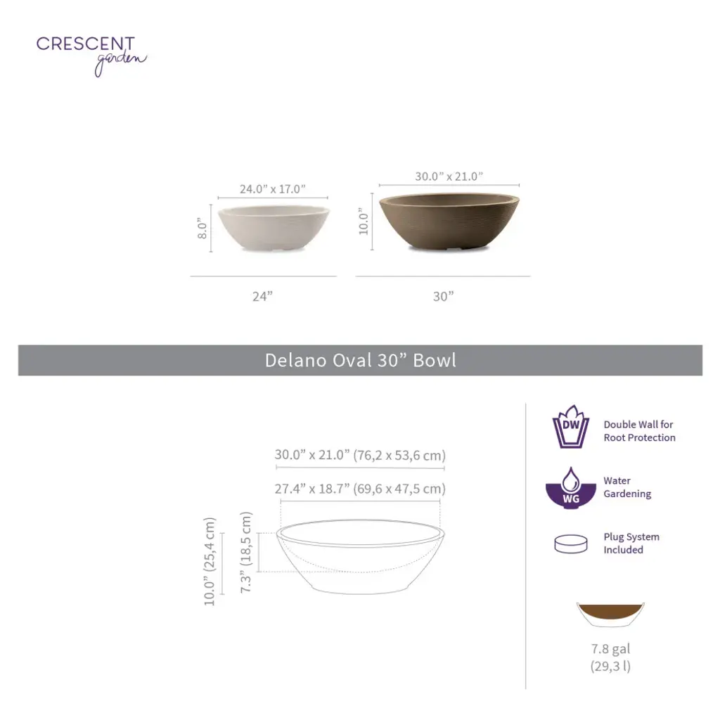 Choose from a small, medium or large bowl planter to house your favorite flowers, succulents and other plants. The simple design blends beautifully with any decor style, whether you place it in the entryway of your home or atop a planter stand in your living room. The double-wall planter also helps insulate the roots of your plants when the temperature shifts from cold to hot, preserving the longevity of the plant''s life. INDOOR/OUTDOOR : Double-walled planter is a perfect indoor and outdoor planting bowl. LIGHTWEIGHT & DURABLE: Constructed with 100% recyclable rotation molded polyethylene, making it lightweight, chip-resistant and durable. WEATHER-RESISTANT : The weather-proof planter structure ensures the planter won''t fade or crack during extreme temperatures. DRAINAGE HOLE: Pre-drilled drainage hole & plug inlcuded. Use plug for water garden, plug with hole for fountains and remove plug for planting. 10-YEAR LIMITED WARRANTY DIMENSIONS: Inner Bowl Dimension: 18.7" W x 27.4 L x 7.3" H ; Soil capacity: 7.75 gal
