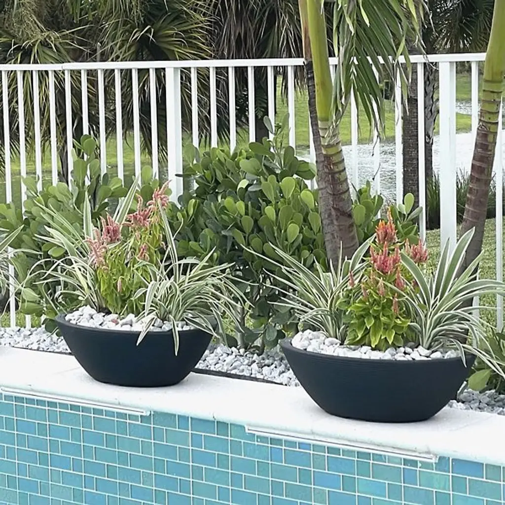 The Crescent Garden Delano Indoor/Outdoor Oval-Shape Planter Bowl has a smooth oval form made by rotation molding polymer resin. Its clean curves are enhanced by a subtle ribbed texture on the exterior. The largest available size comes with a drainage hole plug system that offers you the alternative of using it as a water garden or fountain.
