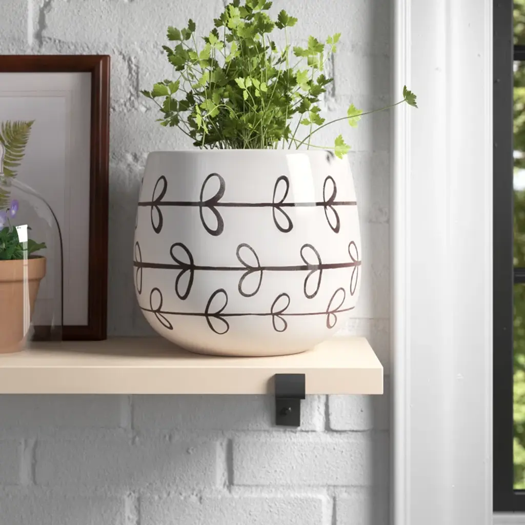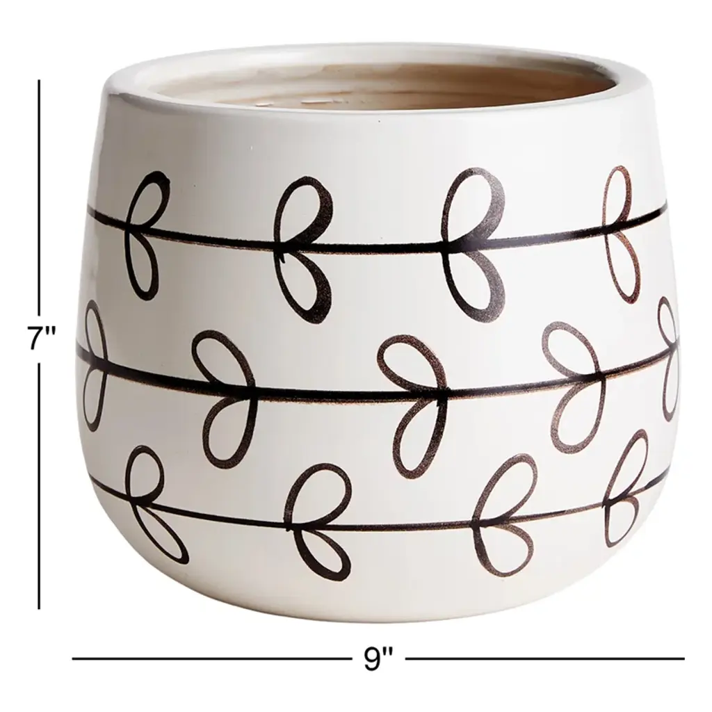 A hand-painted, whimsical black vine motif winds around this simple ceramic pot. A playful style that makes a perfect pair with your lush greens or colorful blooms. A simple, hand-painted vine pattern adorns this cute little pot. It is the perfect vessel for lush greens or a tailored orchid. Its simplistic design will complement your contemporary home. This pot is handcrafted and hand-painted by skilled artisans. Use as cachepot or plant directly into. Protect from frost and hard freeze.