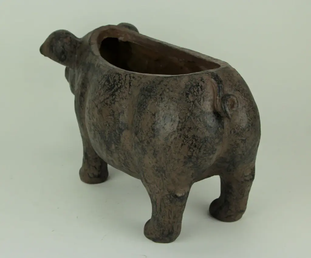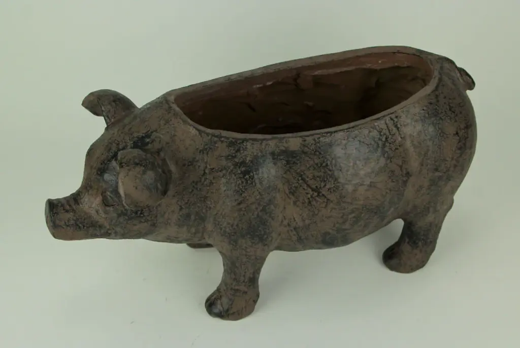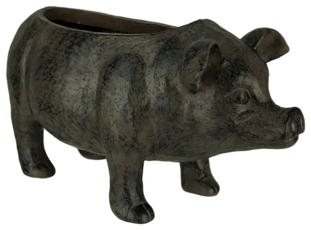 15 inch Long, 8 inch High, 6.75 inch WideCreatively Cast in Durable Resin Designed for Indoor or Outdoor UseDistressed Rustic Brown Finish Takes On a Cast Iron AppearanceDisplay Anywhere Indoors or Outdoors and Give Your Home a Fun Farmhouse LookGreat with Trailing Plants, Succulents, Grasses and Colorful FlowersBrighten up your living space and lend some charm of the farm to your indoor or outdoor greenery with this rustic pig planter. It''s perfect for real or artificial greenery, flowers, trailing plants or you can use it as a table centerpiece in the dining room. Though it is made of durable resin, the distressed blackened brown finish gives it the look of a cast iron piece. It brings a fun farmhouse feel to any home decor setting. This 15 inch long, 8 inch high, 6.75 inch wide pig planter will have your decor blooming with color and a touch of quirky farmhouse character.
