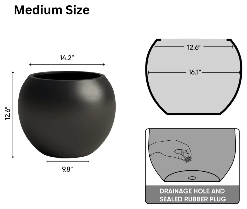 Wide and round like a sphere but with the top cut off, the Mount Sherman planter stands out from the crow. Whether clustered together as a striking group or displayed solo as a standout statement piece, these modern planters exude a unique charm. Crafted from a durable fiberstone composite material, these planters combine fiberglass and natural crushed stone powder, resulting in a lightweight yet ultra-durable construction that can withstand freezing temperatures and high-traffic environments.•DURABLE & LIGHTWEIGHT: This stylish planter is meticulously crafted from a lightweight fiberstone composite material. The fusion of fiberglass and natural crushed stone powder enhances the planter''s strength and durability, all while maintaining a lighter weight compared to traditional stone planters. •WEATHER RESISTANT: Embodying resilience, fiberstone planters are impervious to frost, UV rays, and cracking, making them an ideal choice for both indoor and outdoor settings. Featuring a .6-inch drainage hole and a convenient rubber plug, these planters support proper watering techniques and create optimal growing conditions for your plants.•STYLISH DESIGN: The modern sphere planter is available in a diverse range of captivating colors and sizes, ensuring a seamless fit in any space. Boasting an industrial-chic design aesthetic, these planters introduce a contemporary elegance that effortlessly elevates the ambiance of your living space.•SMALL PLANTER MEASURES: 10" height x 13" diameter (pot opening 8")•MEDIUM PLANTER MEASURES: 13.5" height x 17" diameter (pot opening 10")•LARGE PLANTER MEASURES: 17" height x 21" diameter (pot opening 14.4")•BUY WITH CONFIDENCE: Our customers'' satisfaction means everything to us. We take pride in our product"™s superior quality and craftsmanship. If for any reason you are at all unsatisfied with your purchase, simply contact us. We are so confident in our products that we offer a 30-day limited warranty (see item warranty information for details).•Made In Vietnam