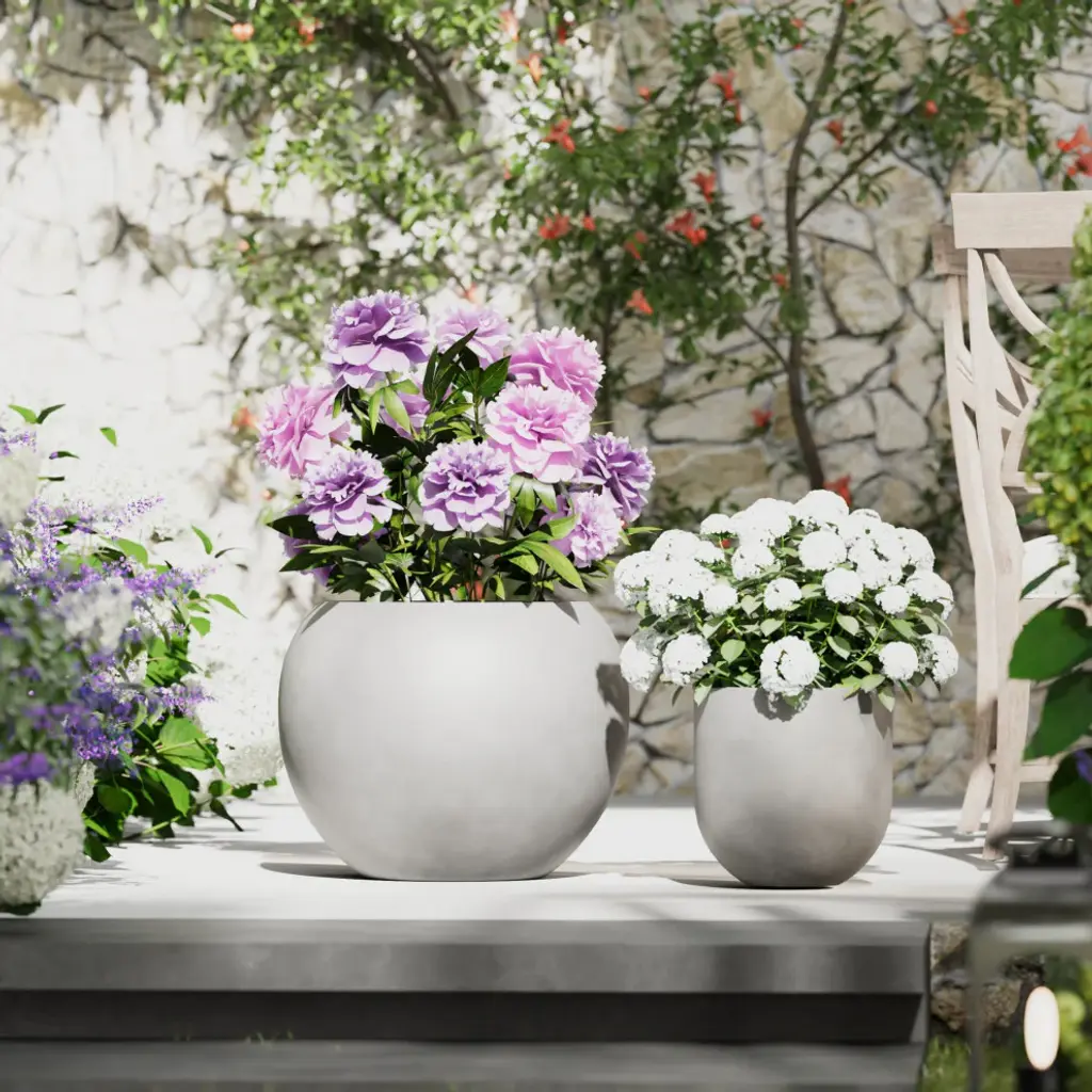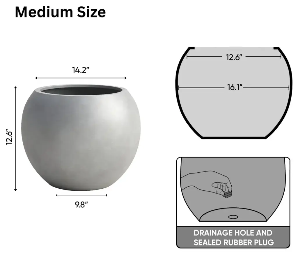 Wide and round like a sphere but with the top cut off, the Mount Sherman planter stands out from the crow. Whether clustered together as a striking group or displayed solo as a standout statement piece, these modern planters exude a unique charm. Crafted from a durable fiberstone composite material, these planters combine fiberglass and natural crushed stone powder, resulting in a lightweight yet ultra-durable construction that can withstand freezing temperatures and high-traffic environments.•DURABLE & LIGHTWEIGHT: This stylish planter is meticulously crafted from a lightweight fiberstone composite material. The fusion of fiberglass and natural crushed stone powder enhances the planter''s strength and durability, all while maintaining a lighter weight compared to traditional stone planters. •WEATHER RESISTANT: Embodying resilience, fiberstone planters are impervious to frost, UV rays, and cracking, making them an ideal choice for both indoor and outdoor settings. Featuring a .6-inch drainage hole and a convenient rubber plug, these planters support proper watering techniques and create optimal growing conditions for your plants.•STYLISH DESIGN: The modern sphere planter is available in a diverse range of captivating colors and sizes, ensuring a seamless fit in any space. Boasting an industrial-chic design aesthetic, these planters introduce a contemporary elegance that effortlessly elevates the ambiance of your living space.•SMALL PLANTER MEASURES: 10" height x 13" diameter (pot opening 8")•MEDIUM PLANTER MEASURES: 13.5" height x 17" diameter (pot opening 10")•LARGE PLANTER MEASURES: 17" height x 21" diameter (pot opening 14.4")•BUY WITH CONFIDENCE: Our customers'' satisfaction means everything to us. We take pride in our product"™s superior quality and craftsmanship. If for any reason you are at all unsatisfied with your purchase, simply contact us. We are so confident in our products that we offer a 30-day limited warranty (see item warranty information for details).•Made In Vietnam