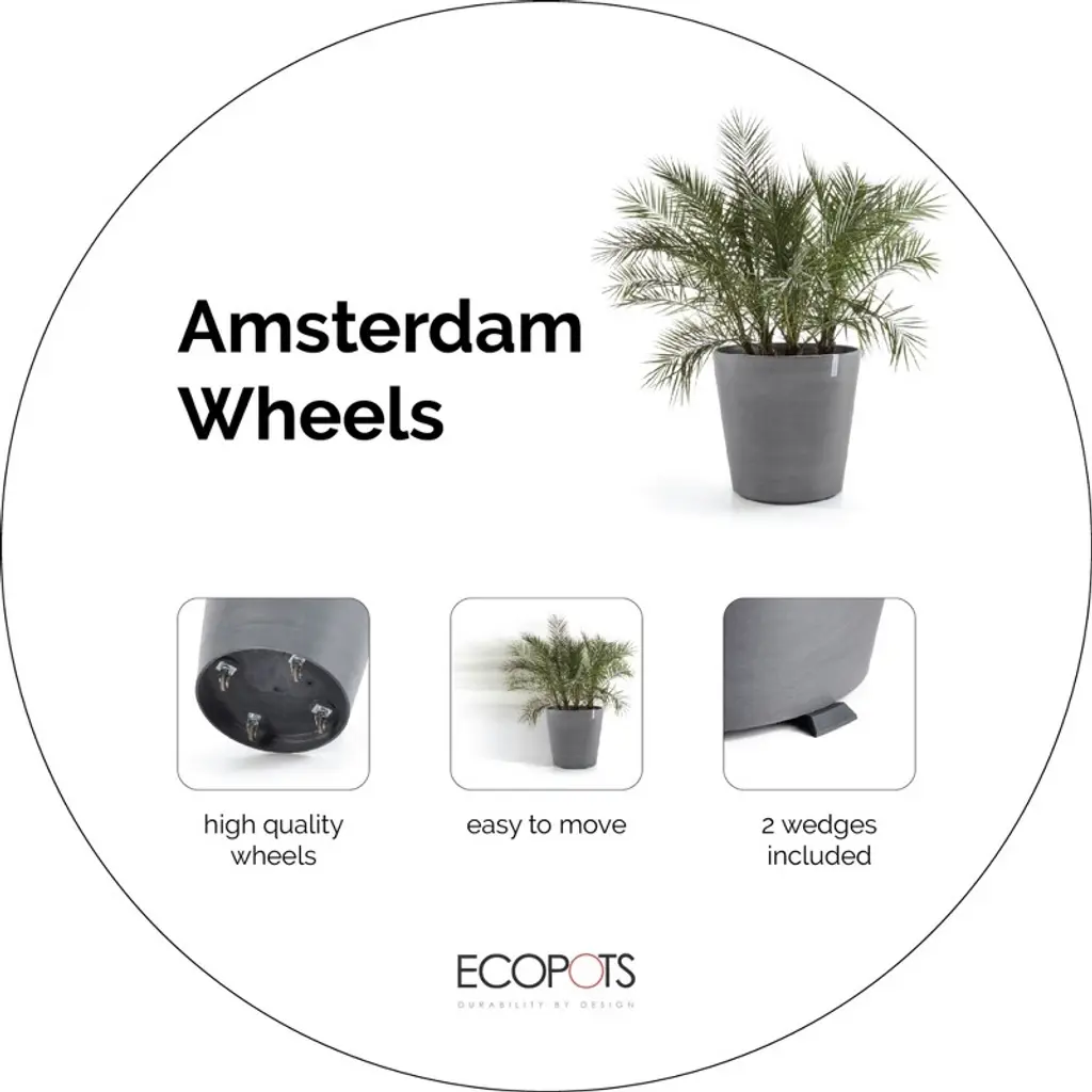 The Ecopots Amsterdam Wheels is a large, round flowerpot with invisible rubber wheels. This pot combines mobility with a stylish design to display your large plants in the most beautiful indoor and outdoor settings. The high-quality integrated wheels ensure easy movement for even the largest plants. The rubber wheels are safe on even the most delicate of surfaces. This flowerpot acts as a magnificent setting for a wide range of plants. Olive trees and other large Mediterranean plants such as agapanthus, oleander and mandevilla are particularly effective. The pot's generous dimensions allow the roots of these large plants sufficient space to grow and bloom. The Ecopots Amsterdam Wheels also include three feet to anchor the pot firmly in place. This ensures both stability and safety, particularly beneficial if, for example, the pot is positioned in a windy spot, or simply if you want to keep it from moving. A handy tip for outdoor use of the Amsterdam Wheels is to take the plug out, so that excess water can flow out easily. This prevents too much water from remaining in the pot. If your patio is susceptible to staining, though, you might choose to leave the plug in to prevent water leaks!
