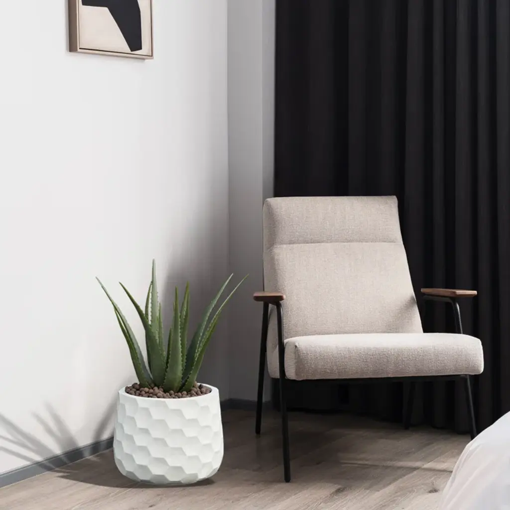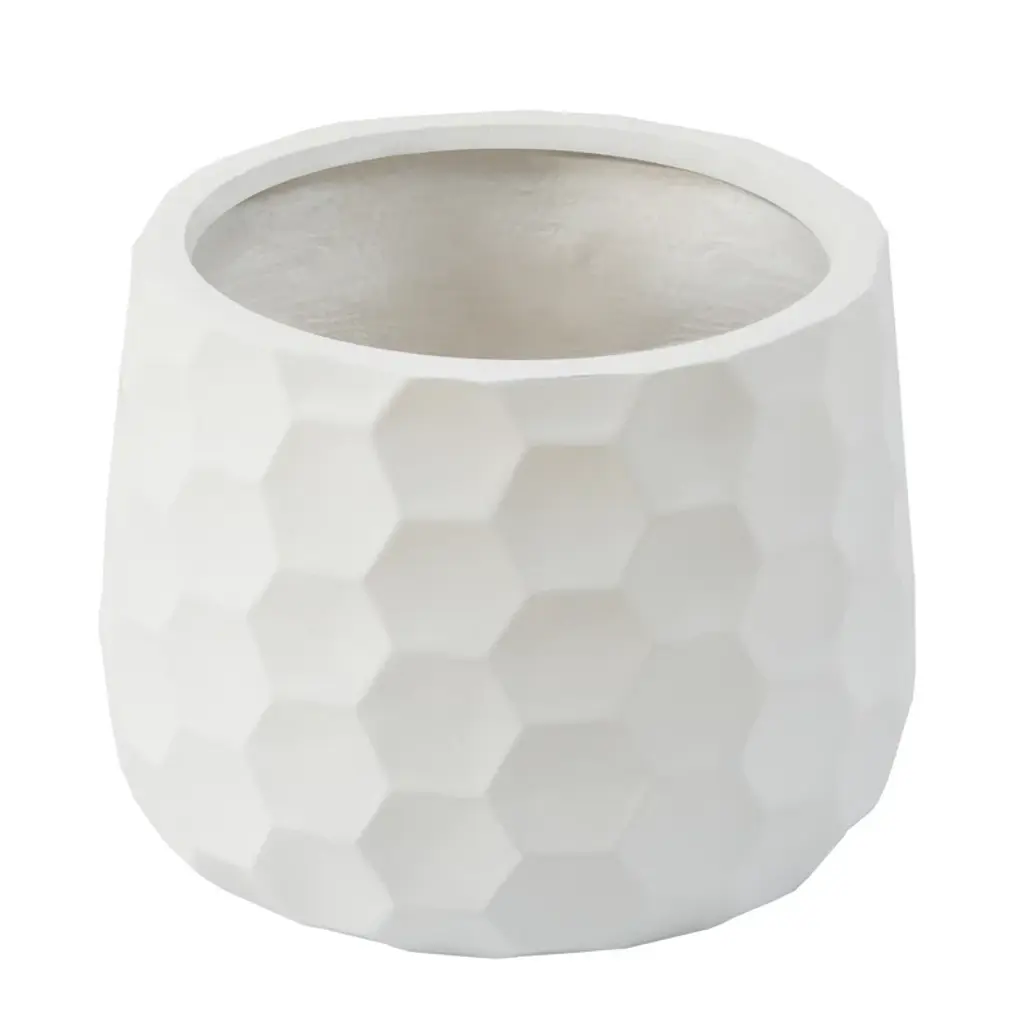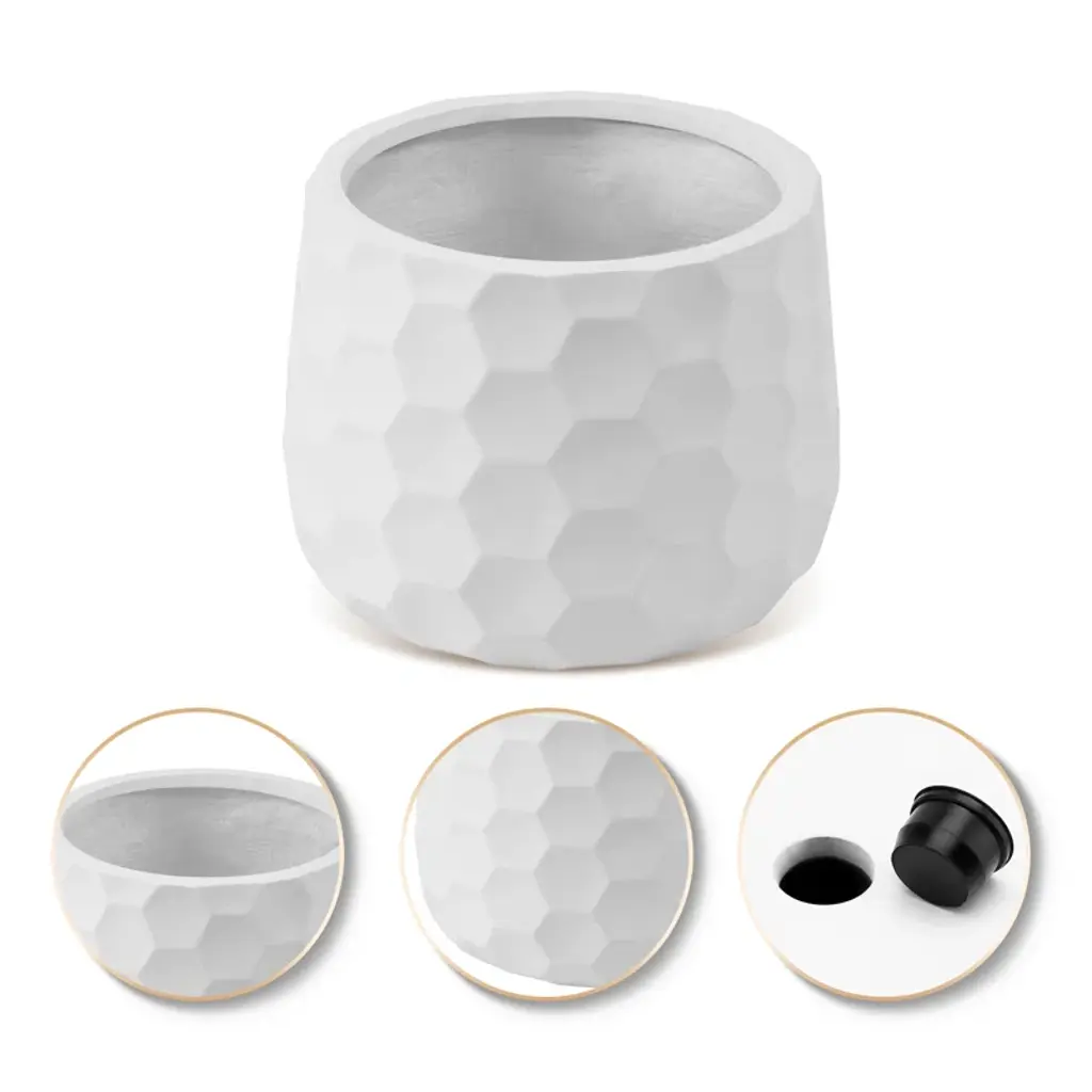 This clean-lined pot planter has a textured look and a durable design that's suitable for year-round outdoor use. It's made from composite and has a glossy white finish and a clean-lined circular silhouette accented with textured hexagons throughout. This planter has a 596.7oz fluid capacity, plus drainage holes to keep your plants or flowers healthy and hydrated. And since it's designed to resist rust and weather, you don't have to worry about UV rays or water wear.