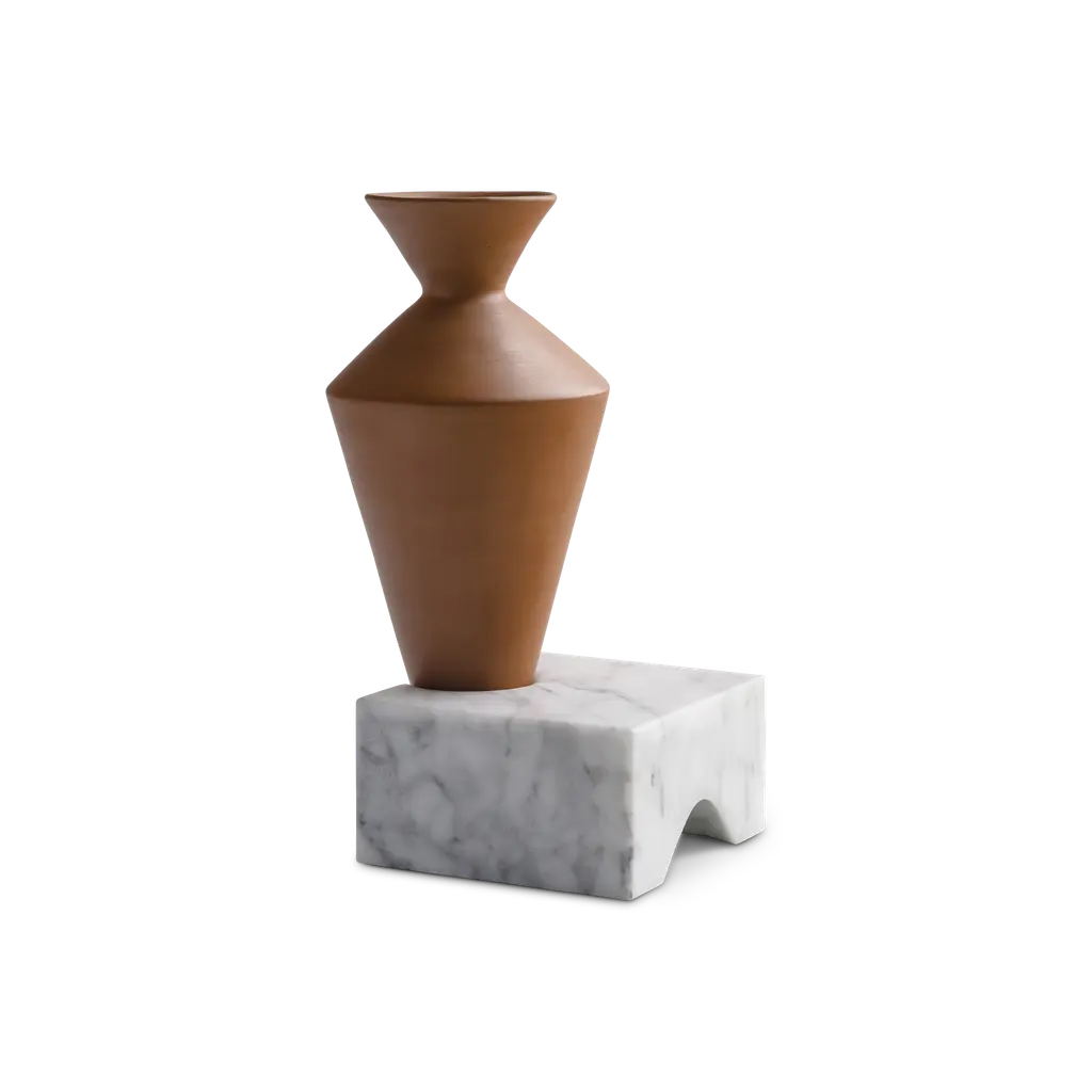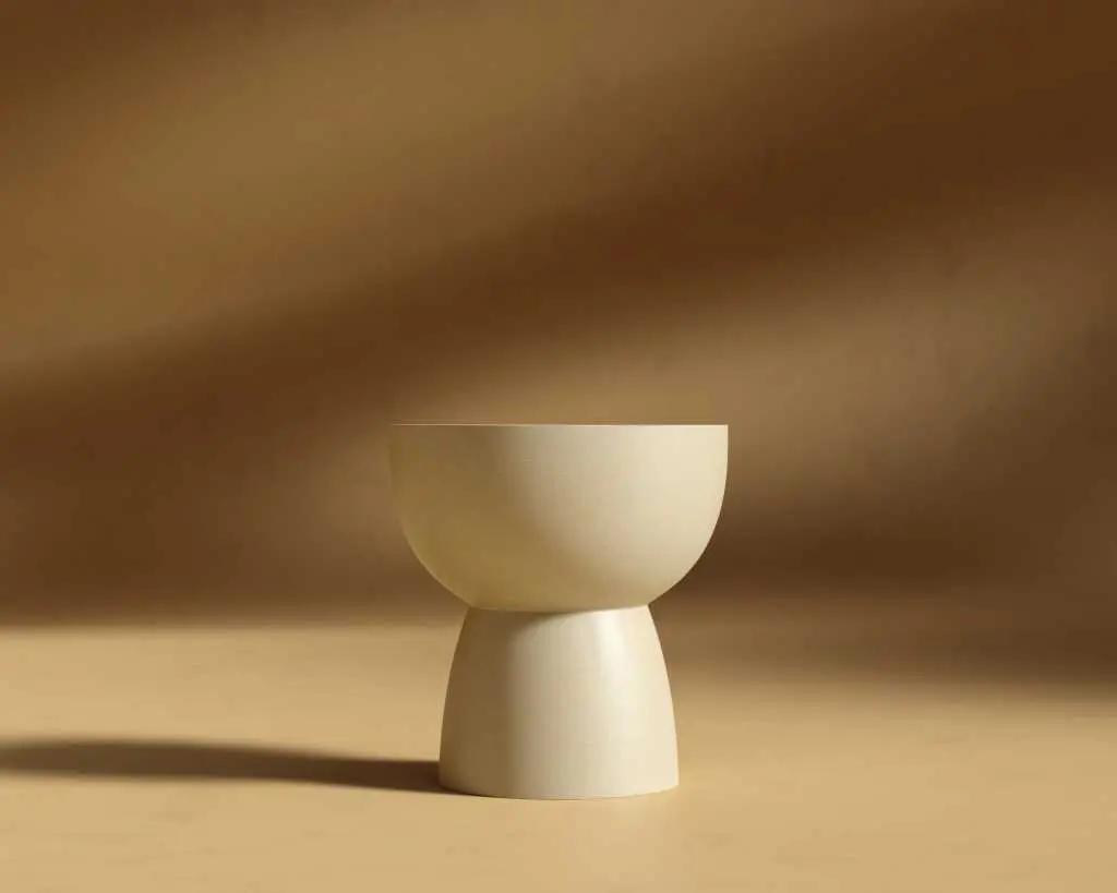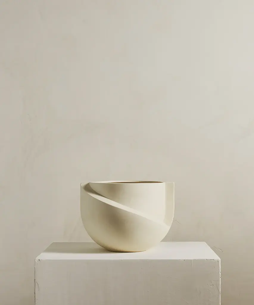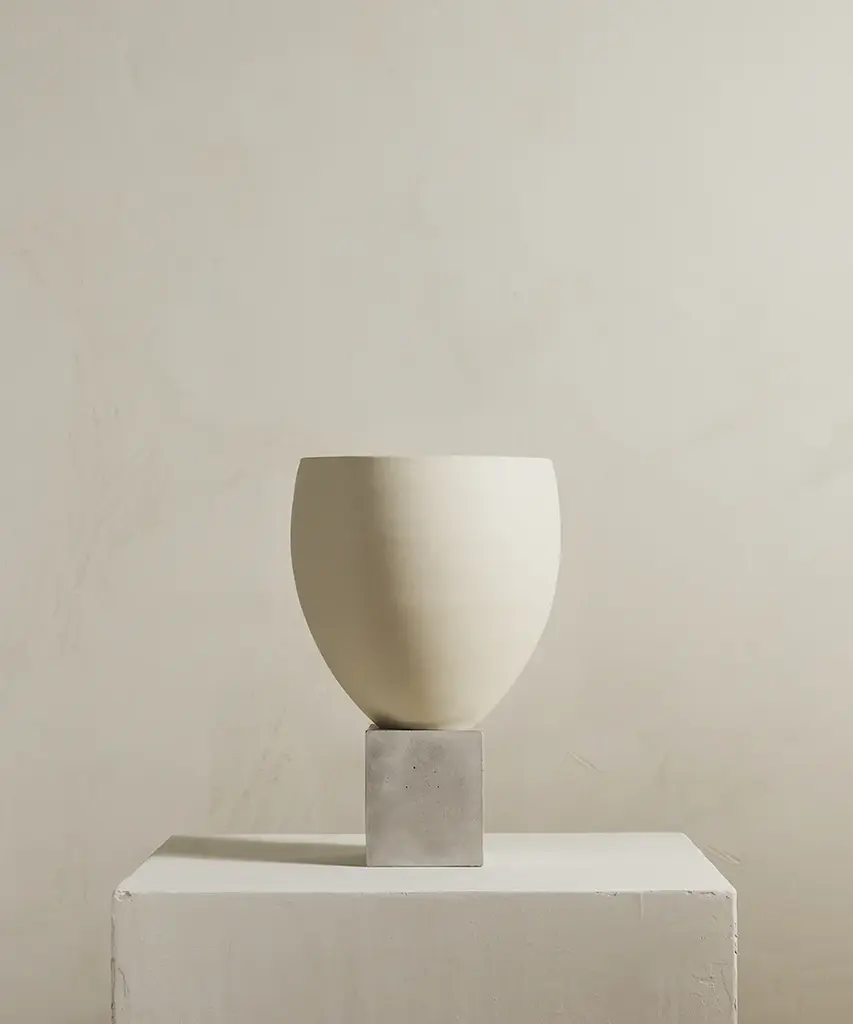 A graceful shape, punctuated by a delicate concrete base. This tabletop planter combines simple, organic lines into an objet d'art for the table. Realized in two matte porcelain finishes - snowy white porcelain and stone grey porcelain. The concrete base is a drainage tray. Designed by Brooklyn-based studio, Light + Ladder. Produced by a family-run, zero-waste facility in Vermont.