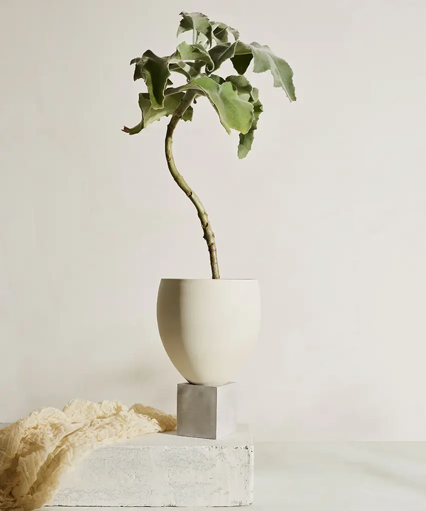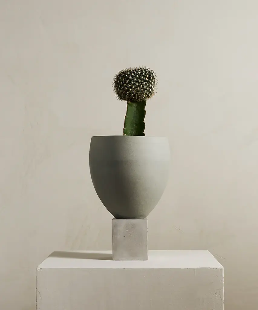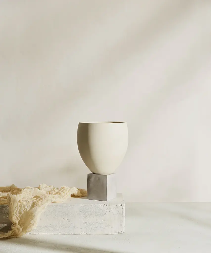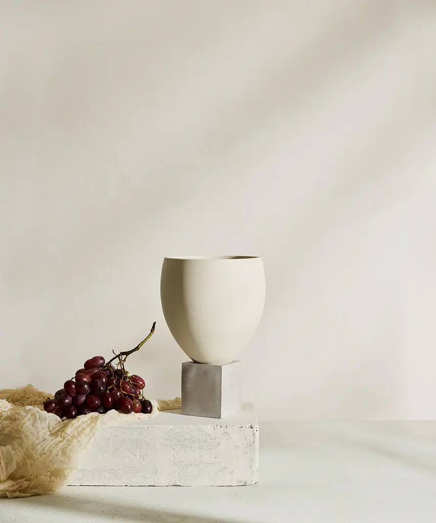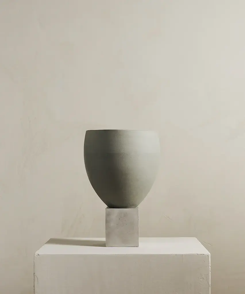 A graceful shape, punctuated by a delicate concrete base. This tabletop planter combines simple, organic lines into an objet d'art for the table. Realized in two matte porcelain finishes - snowy white porcelain and stone grey porcelain. The concrete base is a drainage tray. Designed by Brooklyn-based studio, Light + Ladder. Produced by a family-run, zero-waste facility in Vermont.