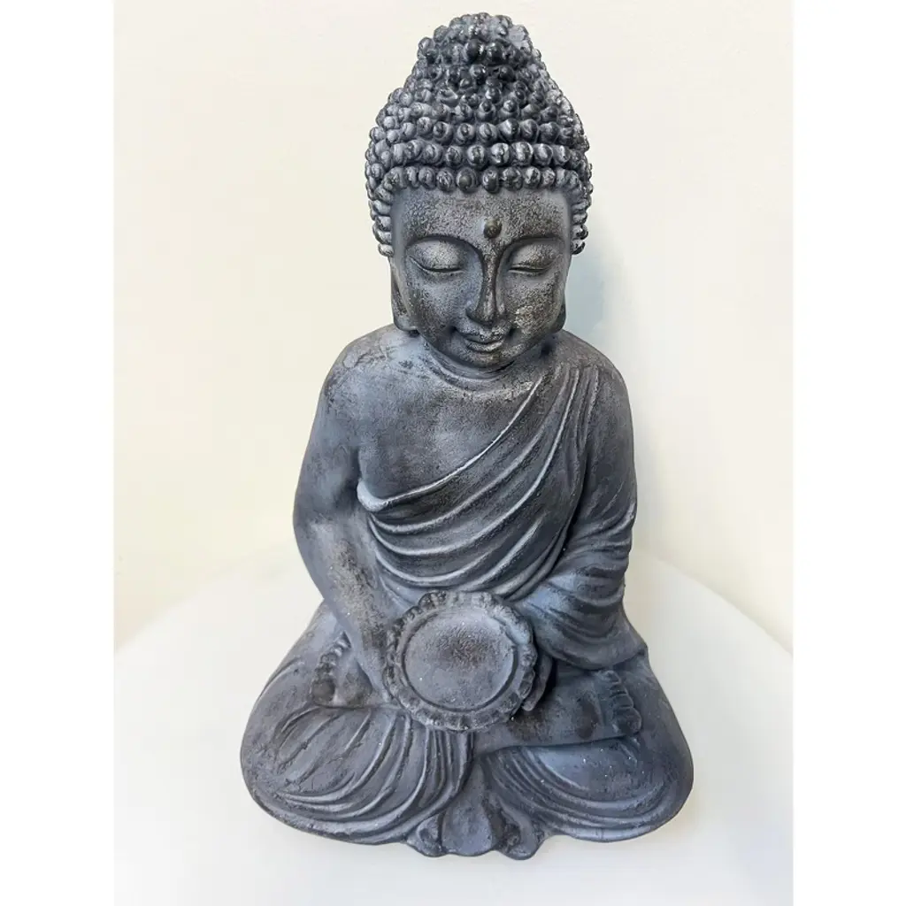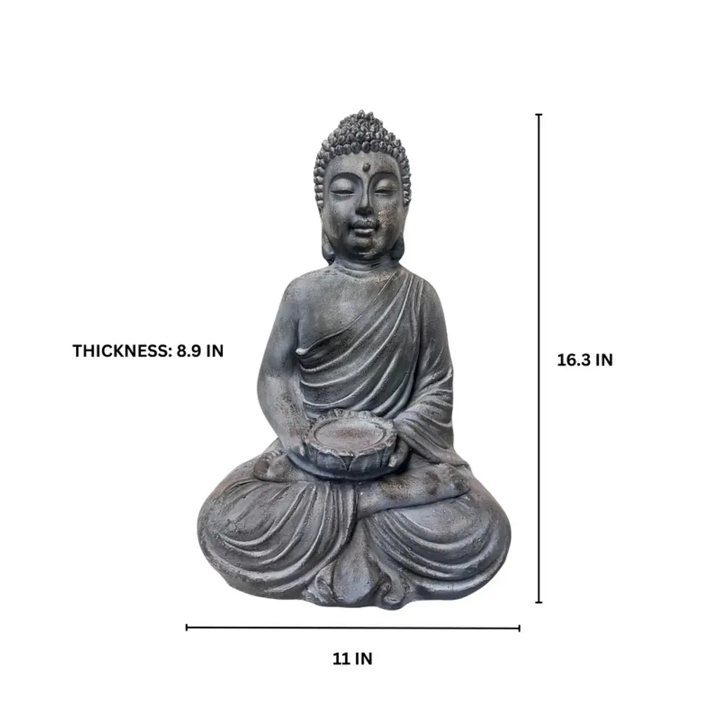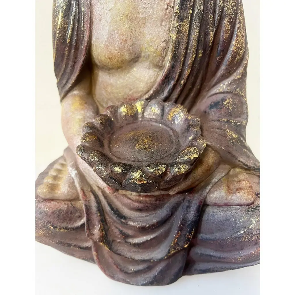 A seated Thai Buddha statue designed as a planter stand, featuring a shallow bowl cradled in the Buddha's hands. Finished in and black. This piece serves as a serene and decorative accent for your home or garden. The aged finish lends a timeless elegance, while the Buddha's seated posture evokes a sense of peace and harmony. Blending spiritual symbolism with practicality, this unique planter stand adds both beauty and function to any space.