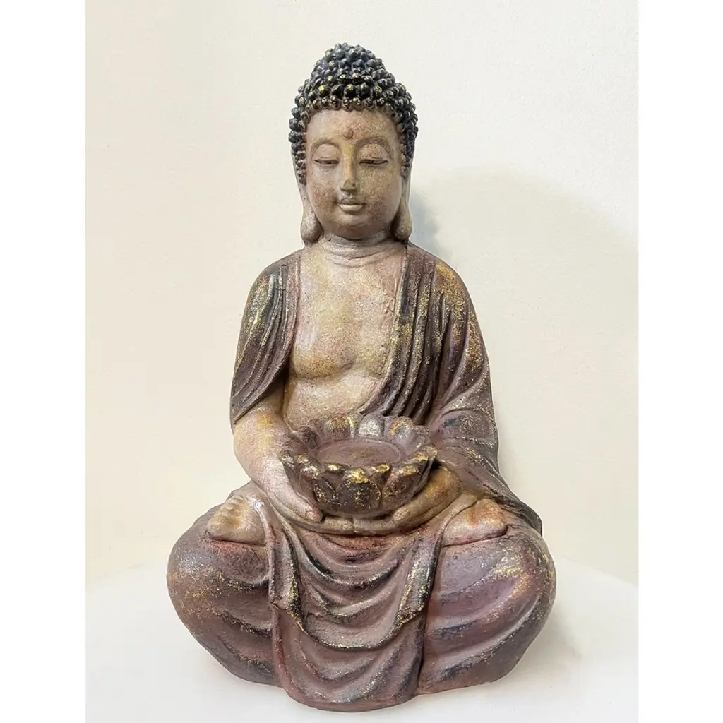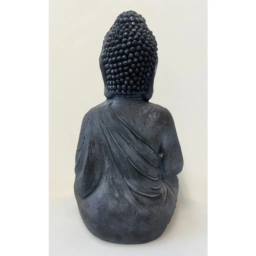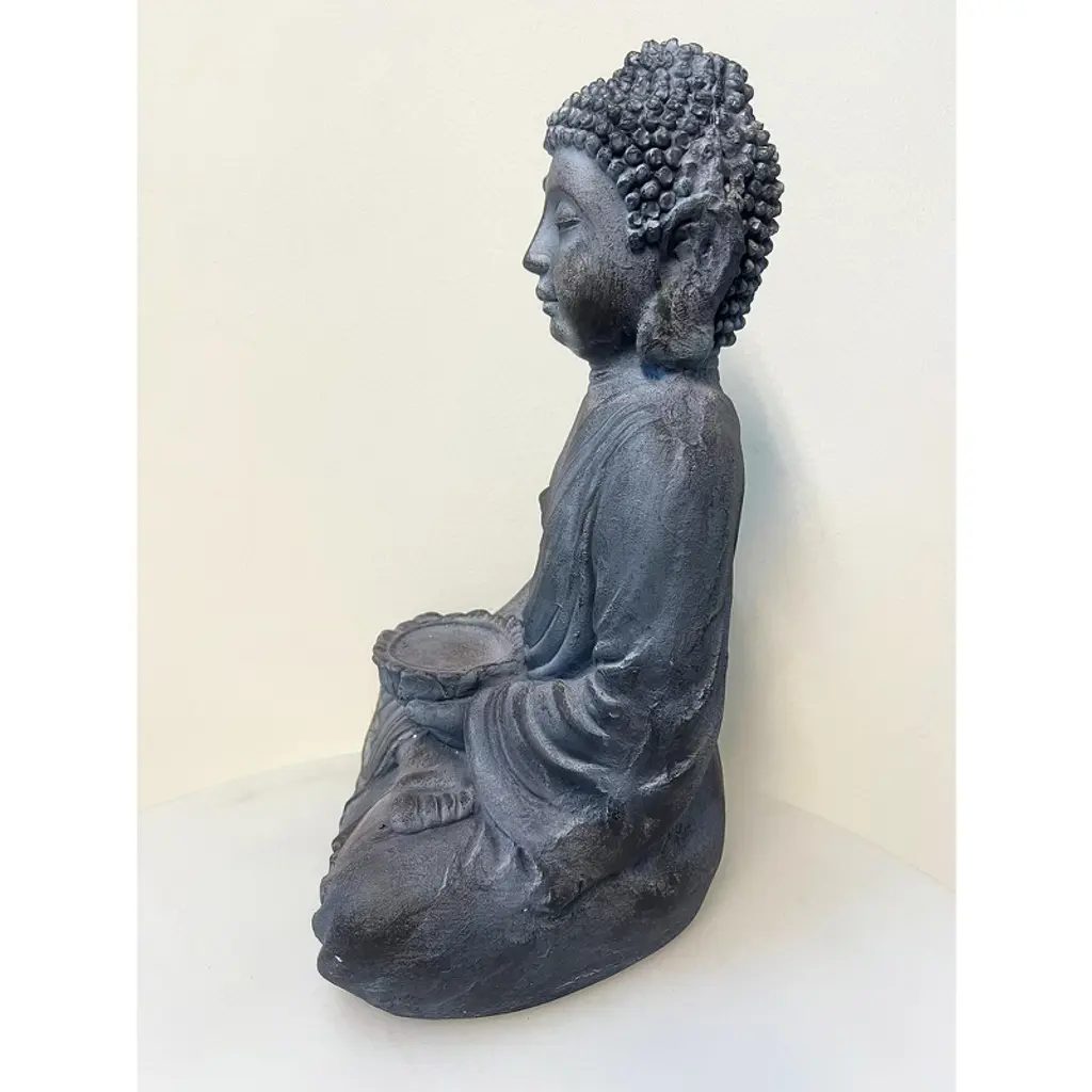 A seated Thai Buddha statue designed as a planter stand, featuring a shallow bowl cradled in the Buddha's hands. Finished in and black. This piece serves as a serene and decorative accent for your home or garden. The aged finish lends a timeless elegance, while the Buddha's seated posture evokes a sense of peace and harmony. Blending spiritual symbolism with practicality, this unique planter stand adds both beauty and function to any space.