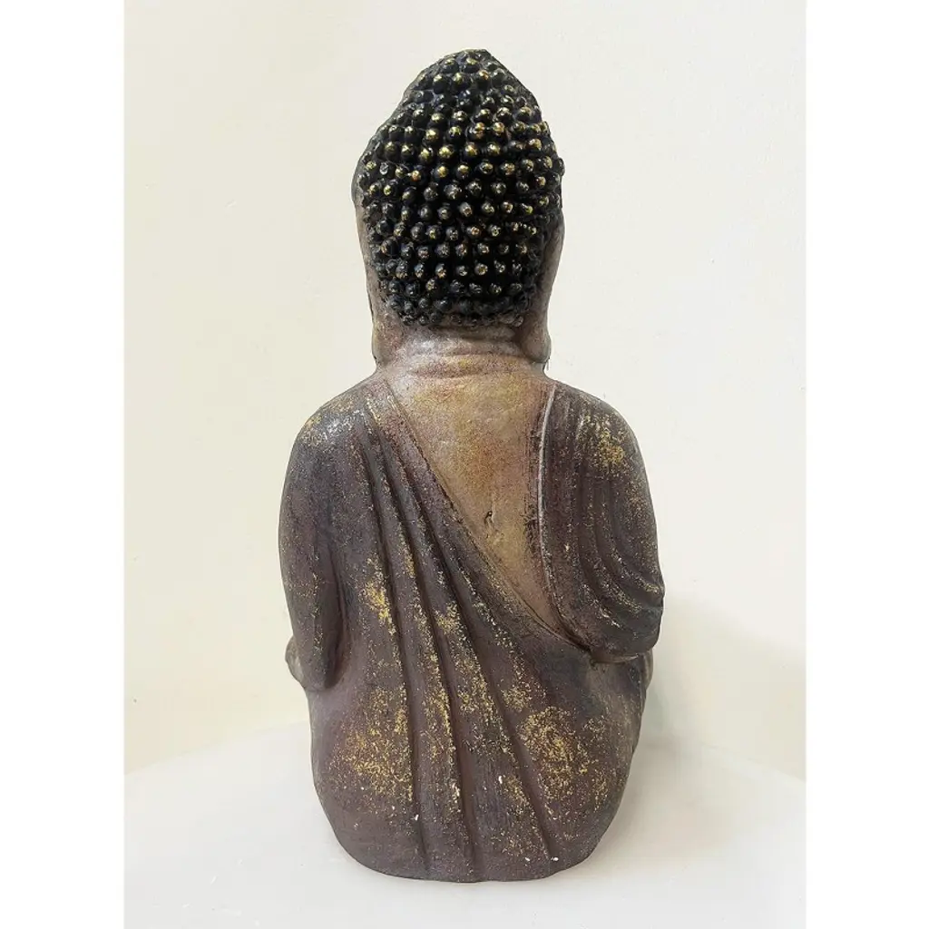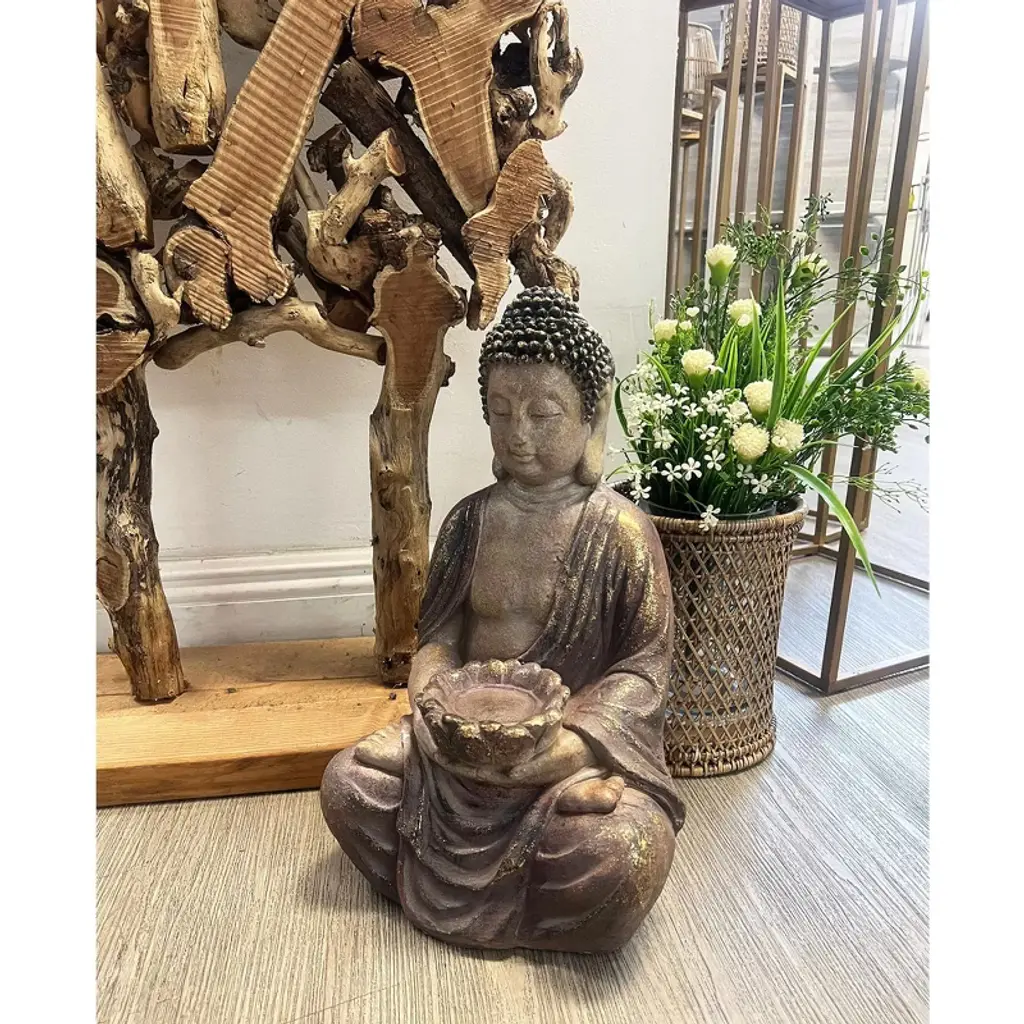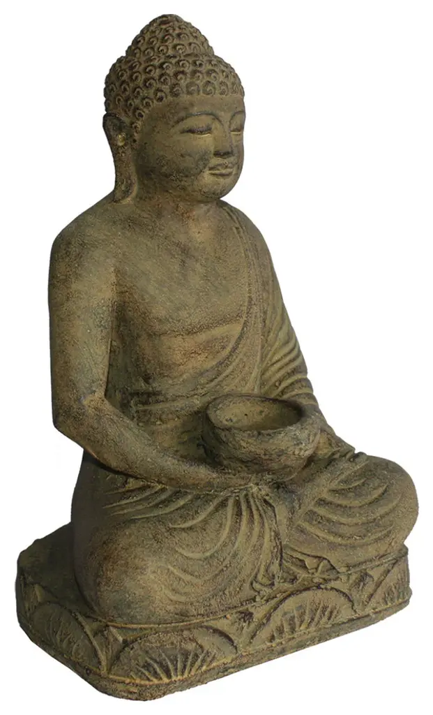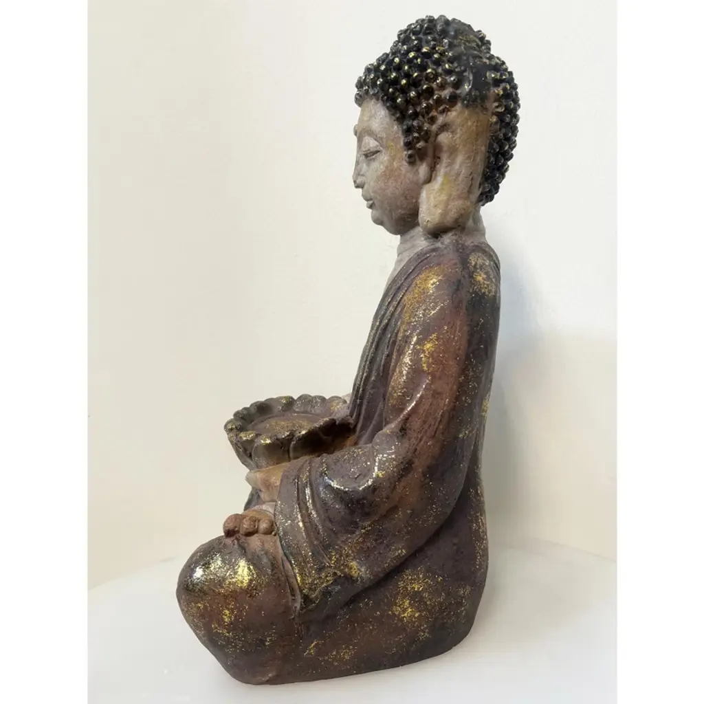 A seated Thai Buddha statue designed as a planter stand, featuring a shallow bowl cradled in the Buddha's hands. Finished in a distressed antique gold. This piece serves as a serene and decorative accent for your home or garden. The aged finish lends a timeless elegance, while the Buddha's seated posture evokes a sense of peace and harmony. Blending spiritual symbolism with practicality, this unique planter stand adds both beauty and function to any space.