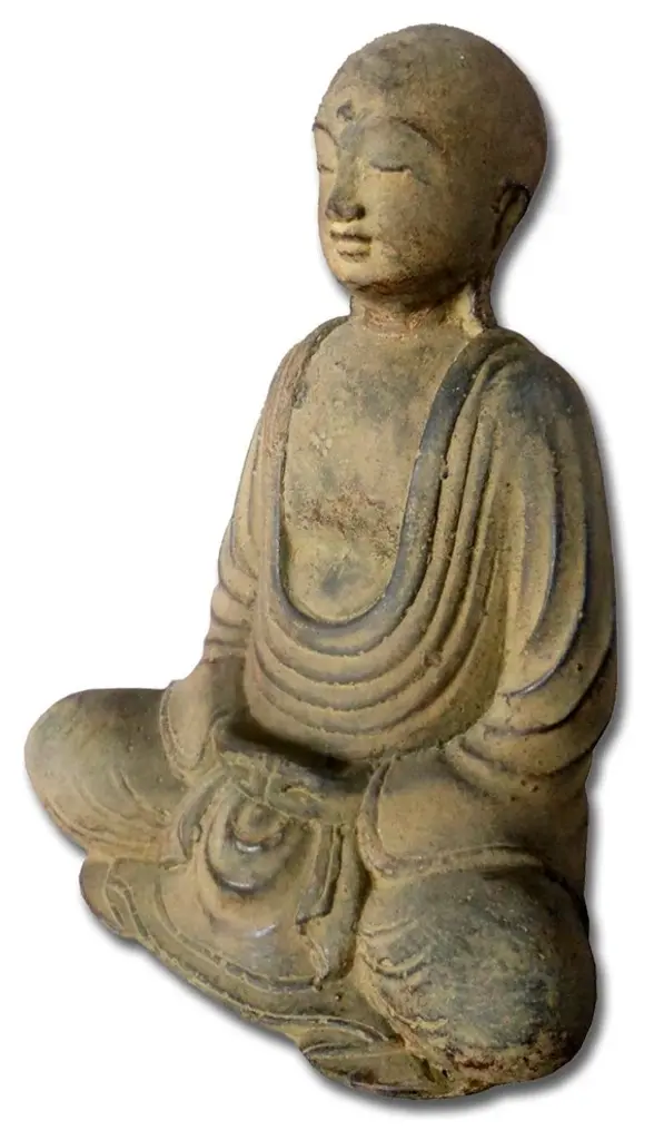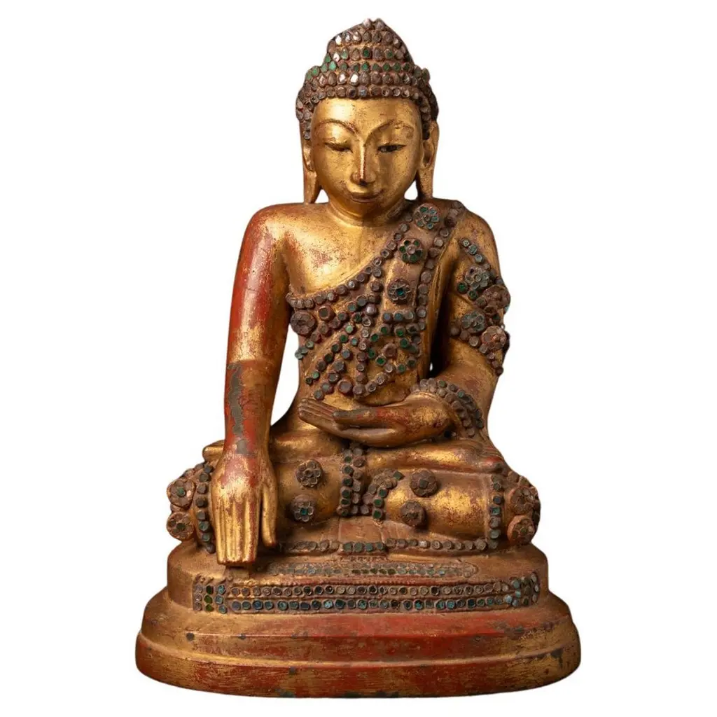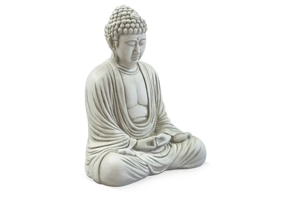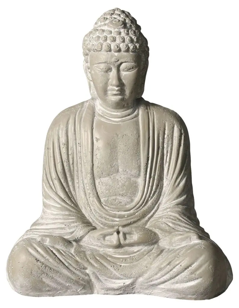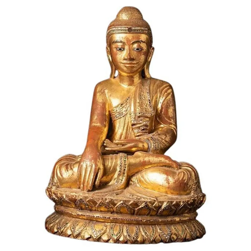 A seated Thai Buddha statue designed as a planter stand, featuring a shallow bowl cradled in the Buddha's hands. Finished in a distressed antique gold. This piece serves as a serene and decorative accent for your home or garden. The aged finish lends a timeless elegance, while the Buddha's seated posture evokes a sense of peace and harmony. Blending spiritual symbolism with practicality, this unique planter stand adds both beauty and function to any space.