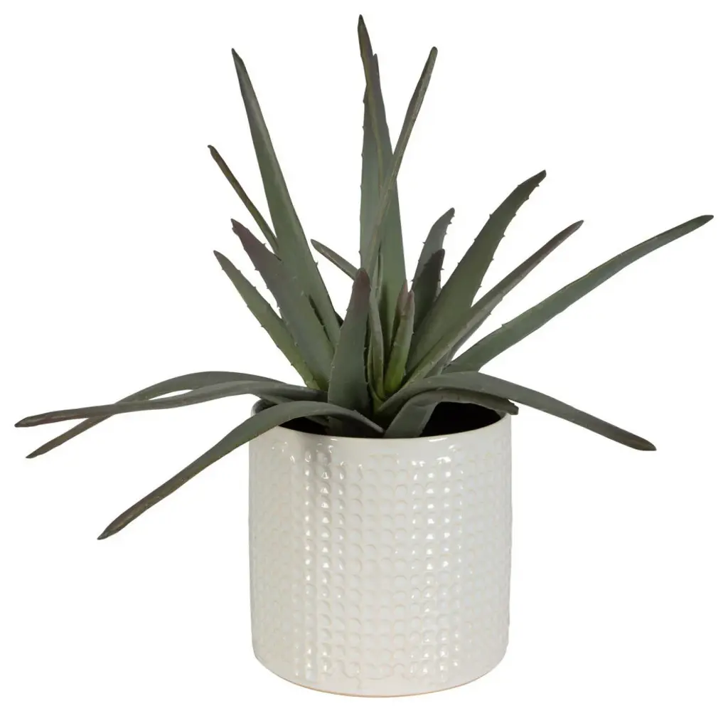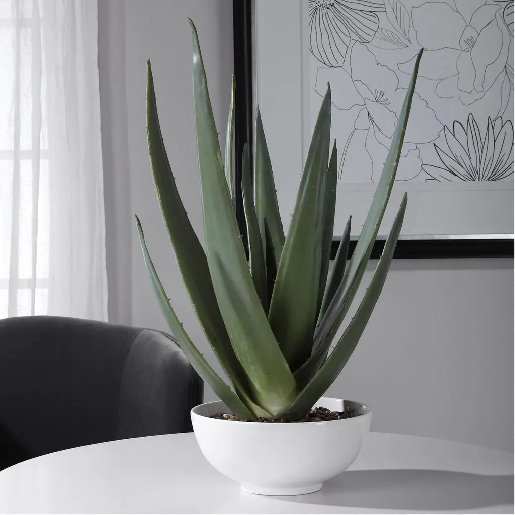 A Contemporary Aloe Vera Statement Piece/Accented With Natural Stones Set Into A Glossy White Textured Bowl.