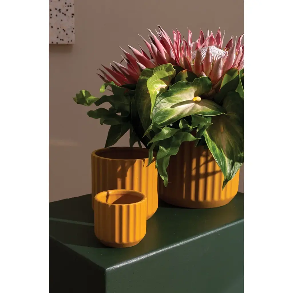 An inviting home for your favorite houseplant, this planter pot showcases a textural ribbed exterior + a sunny orange glaze. It’s handcrafted from sturdy ceramic in a tapered circular silhouette. There are no drainage holes, so leaks aren’t a problem, but add a pebble layer for healthy root growth.