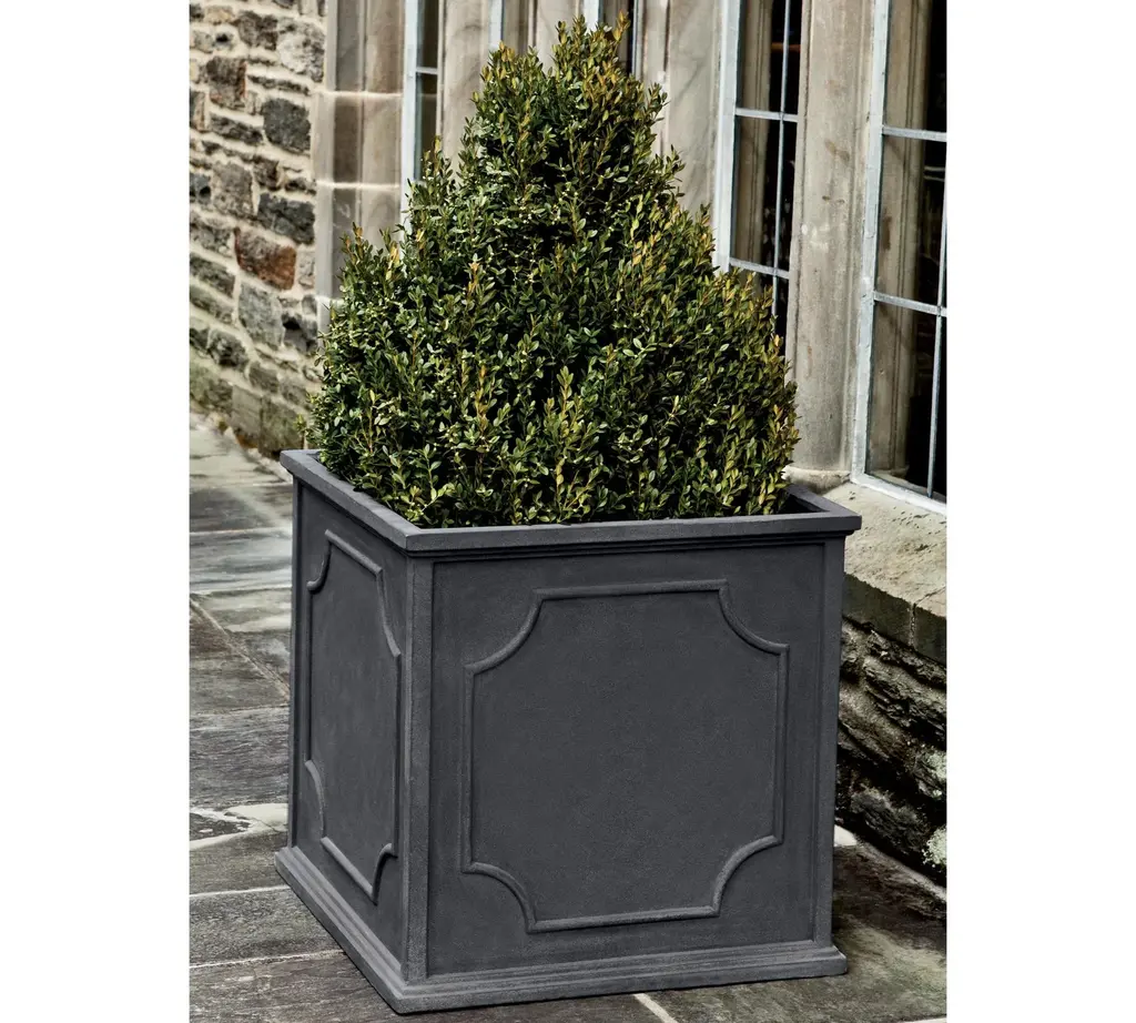 A square planter of Fiber Clay Composite in a lead lite finish. Available in multiple sizes or as a set of four. This listing is for the planter only. No plants are included with purchase.
