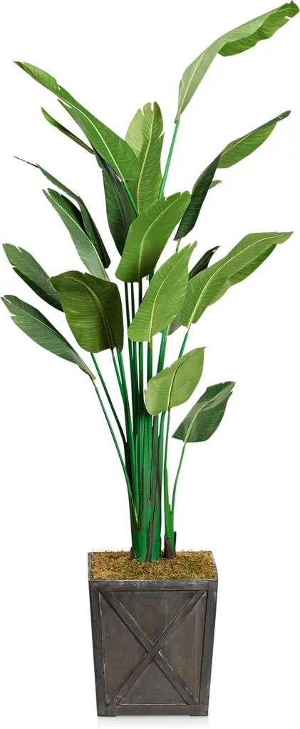 Graceful, larger leaves with smooth ridges—just like the real thing. The Faux Travelers Palm Tree brings you to paradise, again and again. Potted in our Farmhouse Wood Planter for a touch of rustic charm.