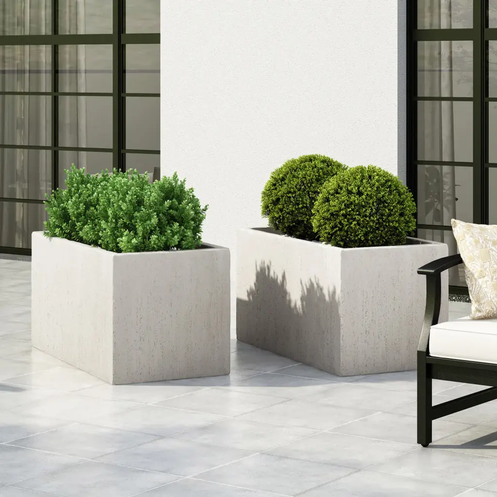 Elevate your outdoor space with a simple and effortless touch. From its simple rectangular design to its lightweight concrete structure, our planter set will instantly enhance your patio or backyard space with style. These accessories offer a durable construction to ensure that your plants have a stable home to grow. Complemented with a stone-like finish, this planter set offers a classic look to your garden or porch. Perfectly crafted to hold your plants, this set is the perfect accessory for your green thumb. A TOUCH OF PERSONALITY: Bring your outdoor area to life with our delightful cast stone planters. With sleek aesthetics, these accessories will not only enliven your backyard or patio space but also provides space to grow plants. RECTANGULAR DESIGN: This planter set features clean rectangular shapes, giving your outdoor space a simple yet stunning accent. This offers a natural look that will seamlessly blend into any decor. CAST STONE: Constructed with lightweight concrete, this planter set offers a rugged, stone-like design that also has a highly durable structure and is resistant to outdoor elements. DIMENSIONS: Choose an accessory that is the perfect size for you and your outdoor space. Each planter has dimensions of 35.25" W x 18.00" D x 18.00" H. You will love how much your space can transform with the simple addition of this accessory. NO ASSEMBLY: This planter set comes ready to use straight out of the box. No assembly is required. This comes as a set of two.Includes: Two (2) PlantersMaterial: Lightweight ConcreteFinish: WhiteHand-Crafted DetailsNo Assembly RequiredDimensions: 18.00 inches deep x 32.25 inches wide x 18.00 inches high